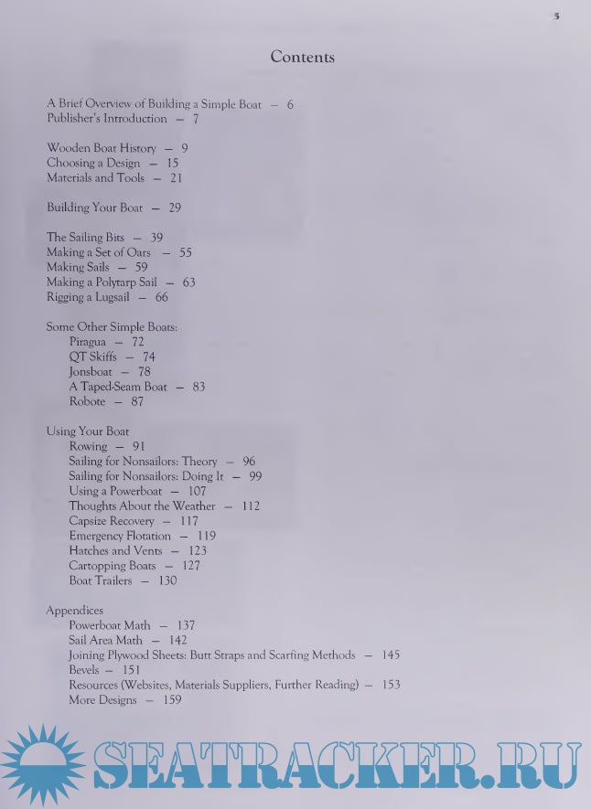 The main focus of the book is on building the 14-foot sailing/rowing skiff called "Mayfly." Full plans and detailed step-by step instructions are given, with numerous line drawings and photographs. Those instructions can then be applied to the other full plans included: for a dinghy, a motorboat, a rowboat, a canoe, and two other sailboats.