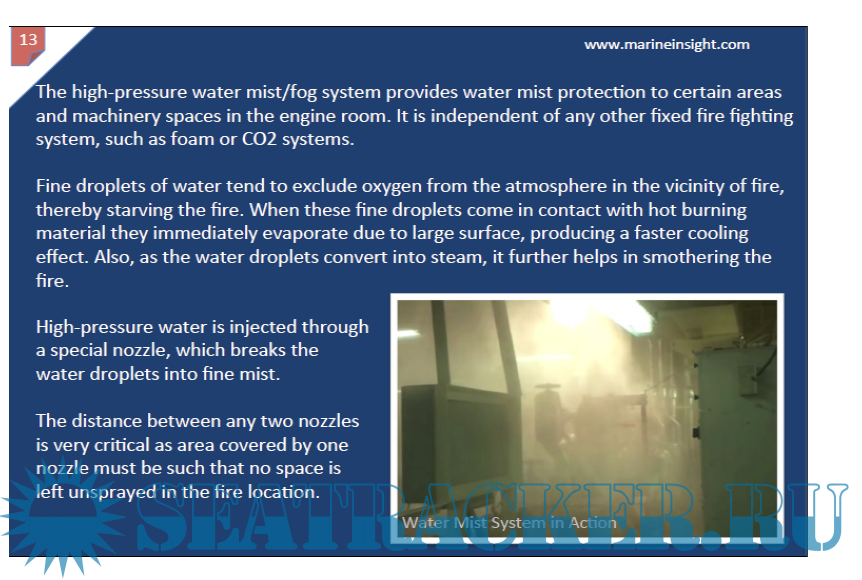 Description: Fixed fire fighting systems are an essential component of the ship’s engine room fire protection system. They help in suppressing fire by reducing the available oxygen in the atmosphere to the point where combustion can no longer take place.