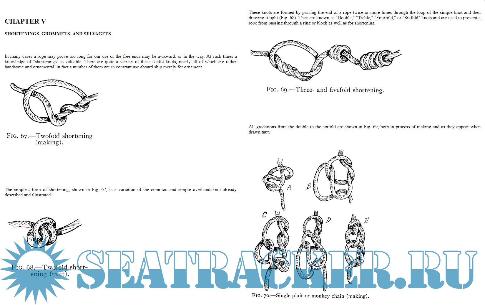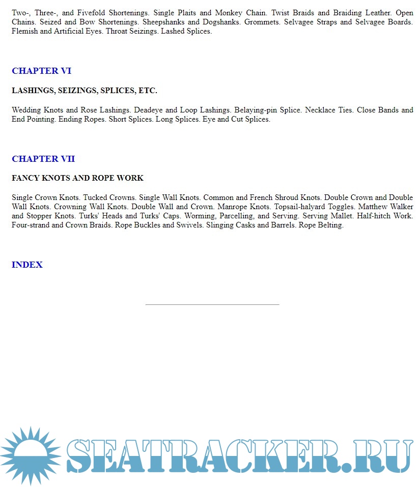 A practical treatise giving complete and simple directions for making all the most useful and ornamental knots in common use, with chapters on splicing, pointing, seizing, serving, lashings, shortening and grommets. Illustrated with 156 original cuts showing how each knot, tie or splice is formed, and its appearance when complete.