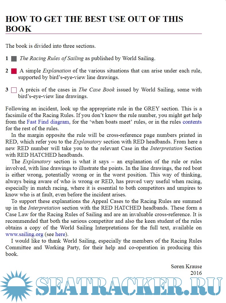 The main purpose of this manual is to provide a handy and easily-read guide for all of us to understand and interpret the rules identically. The Racing Rules are probably among the most complicated of any sport. They are hard to comprehend even if a great effort is made, when writing the Rules, to use language that is modern and easily read. There is also a constant flow of new interpretations, clarifications and changes to the Rules. Also, the use of the same Rules in match racing and the introduction of ‘on the water judging’ in fleet races have introduced a more aggressive use of the Rules as a weapon against competitors. The best way to avoid problems is still to sail against others in the same way that you wish to be sailed against. This unwritten rule is the best way of preserving friendships and promoting the desire to participate in sailboat racing.