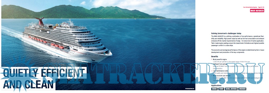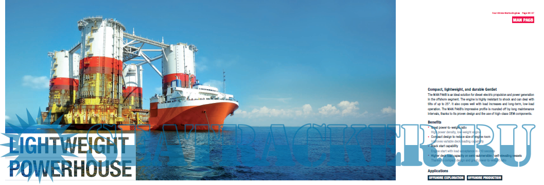 Year: 2010 Language: english Author: MAN Diesel & Turbo Genre: Technical book Publisher: MAN Diesel & Turbo Edition: 1st Format: PDF Quality: Scanned pages Pages count: 35 Description: MAN Diesel & Turbo is the world’s leading provider of large-bore diesel engines and turbomachinery. Our portfolio includes four-stroke and two-stroke engines for marine and stationary applications, turbochargers and propellers, gas and steam turbines, compressors and chemical reactors. Our four-stroke engines offer propulsion and auxiliary power for all types of applications. We also provide dual fuel engines and complete propulsion packages. Around 50 percent of all global ocean-going trade is today powered by MAN engines. We are committed to minimizing fuel consumption while meeting the most advanced emission regulations. The MAN PrimeServ brand supports our customers all around the world with a comprehensive range of after-sales services.