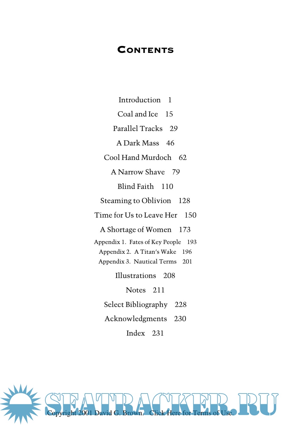 The new but no-less harrowing Titanic story that Captain David G. Brown unfolds is one involving a tragic chain of errors on the part of the well-meaning crew, the pernicious influence of the ship's haughty owner, who was aboard for the maiden trip, and a fatal overconfidence in the infallibility of early twentieth-century technology. Among the most startling facts to emerge are that theTitanic did not collide with an iceberg but instead ran aground on a submerged ice shelf, resulting in damage not to the ship's sides but to the bottom of her hull. First Officer Murdoch never gave the infamous CRASH STOP ("reverse engines") order; rather, he ordered ALL STOP, allowing him to execute a nearly successful S-curve maneuveraround the berg. The iceberg did not materialize unheralded from an ice-free sea; theTitanic was likely steaming at 22 1/2 knots through scattered ice, with no extra lookouts posted, for two hours or more before the fatal encounter. Visibility was not poor that night, and the only signs of haze or distortion were those produced by the ice field itself as the Titanic approached. Most startling of all, however, is evidence that the ship might have stayed afloat long enough to permit the rescue of all passengers and crew if Captain Smith, at the behest of his employer, Bruce Ismay, had not given the order to resume steaming.