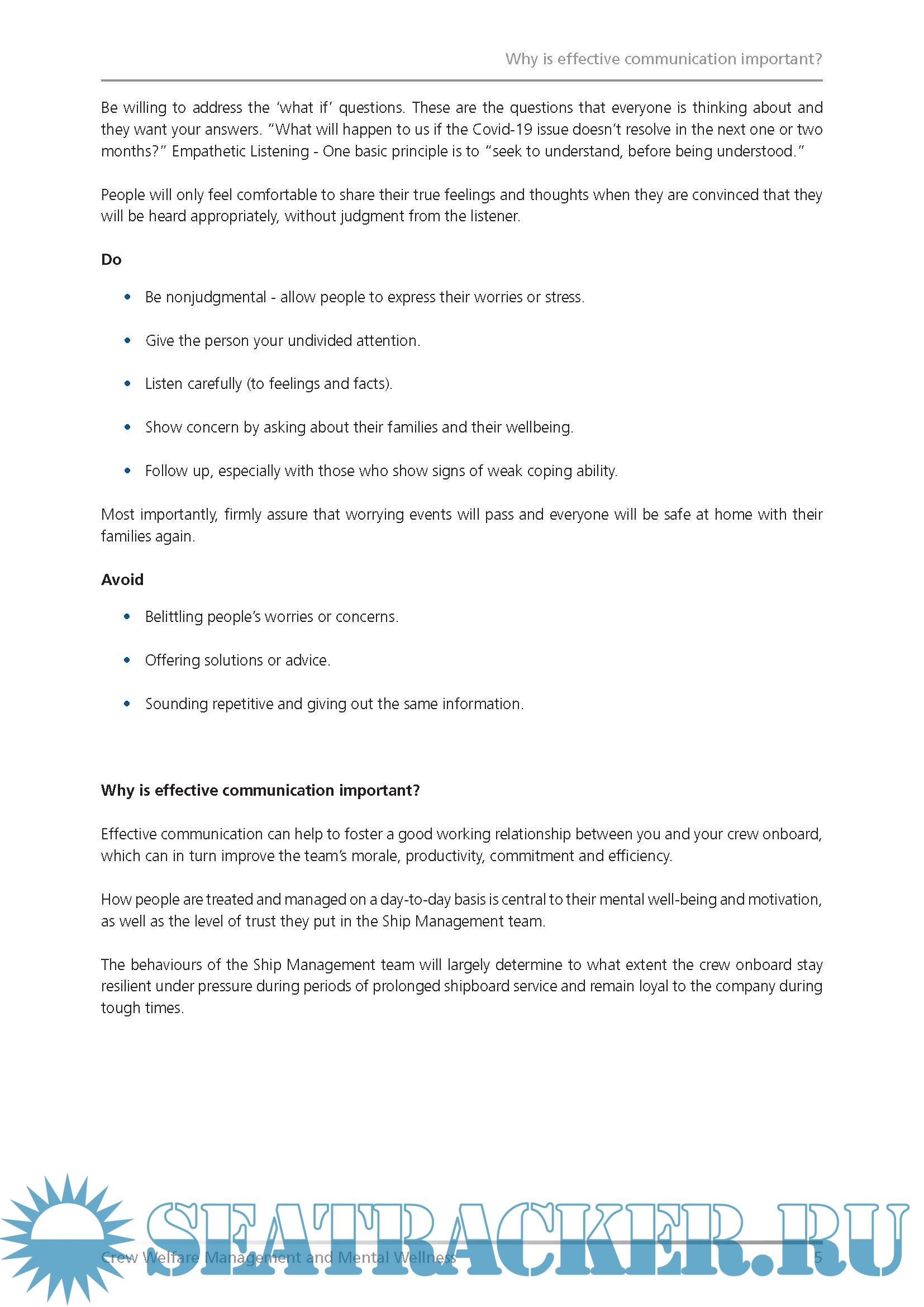 Year: 2020 Language: english Author: Intertanko Genre: Guide Format: PDF Quality: eBook Pages count: 13 Description: The guidance includes advice on helping seafarers to deal with emotional stress and overcome negative feelings. While this guidance has been written during the Covid-19 global pandemic, the key principles are applicable at any time.
