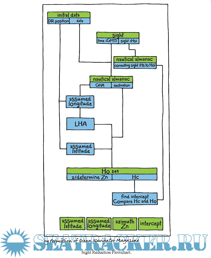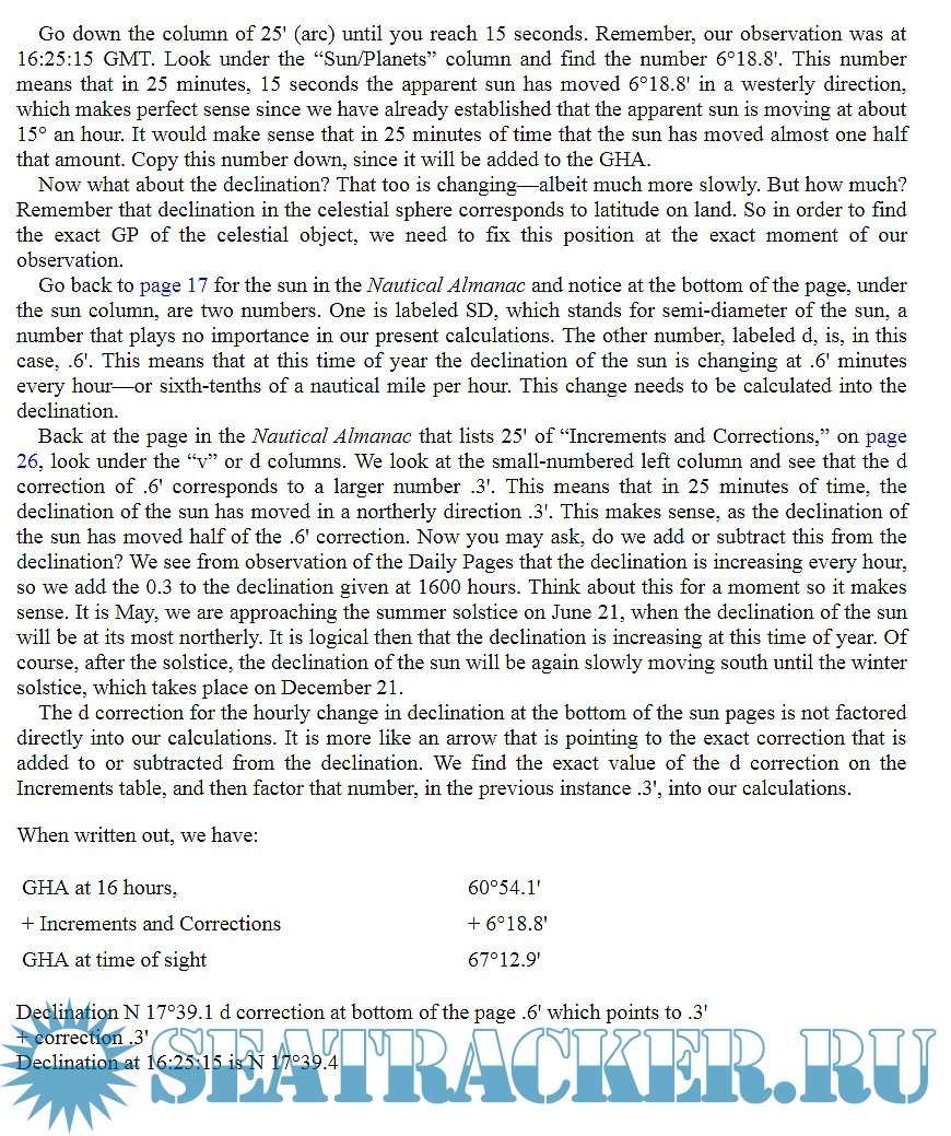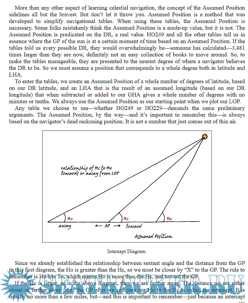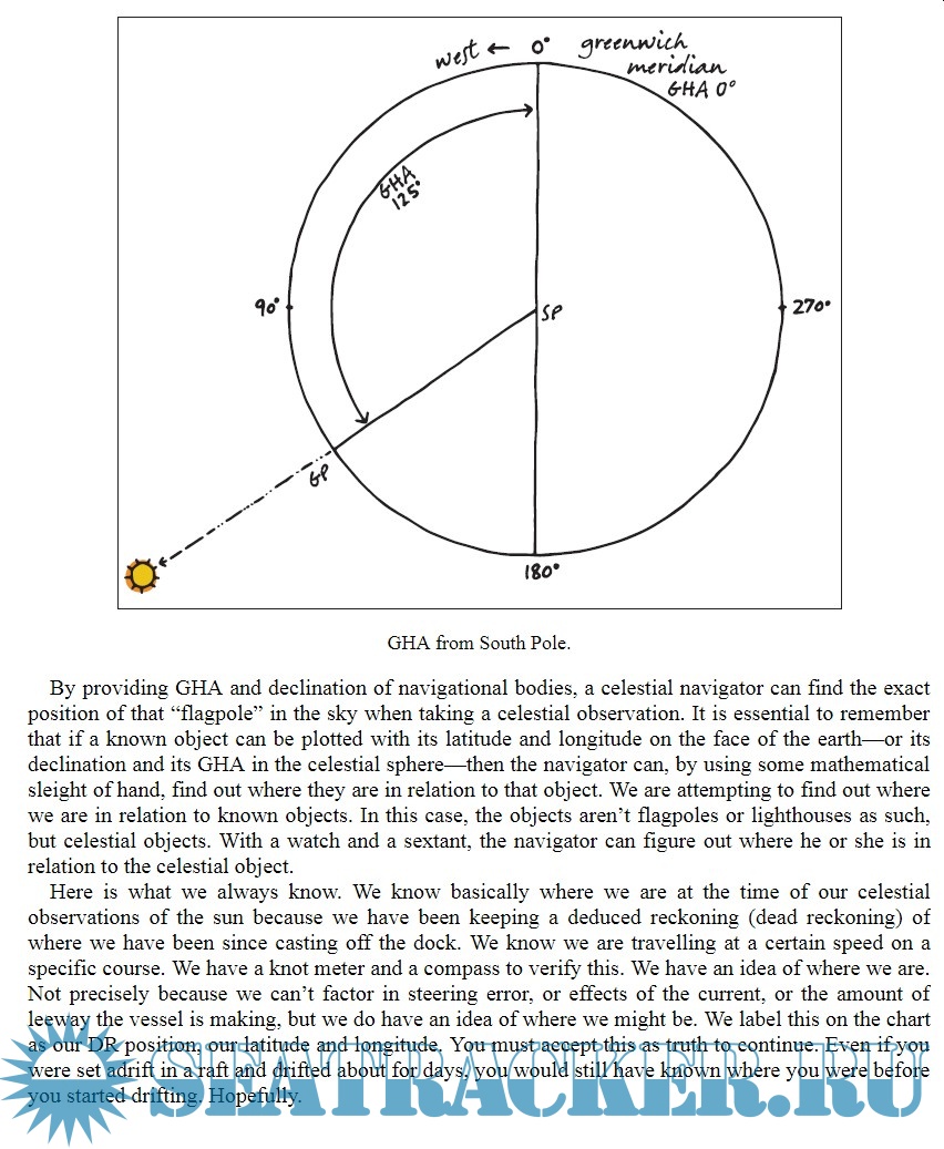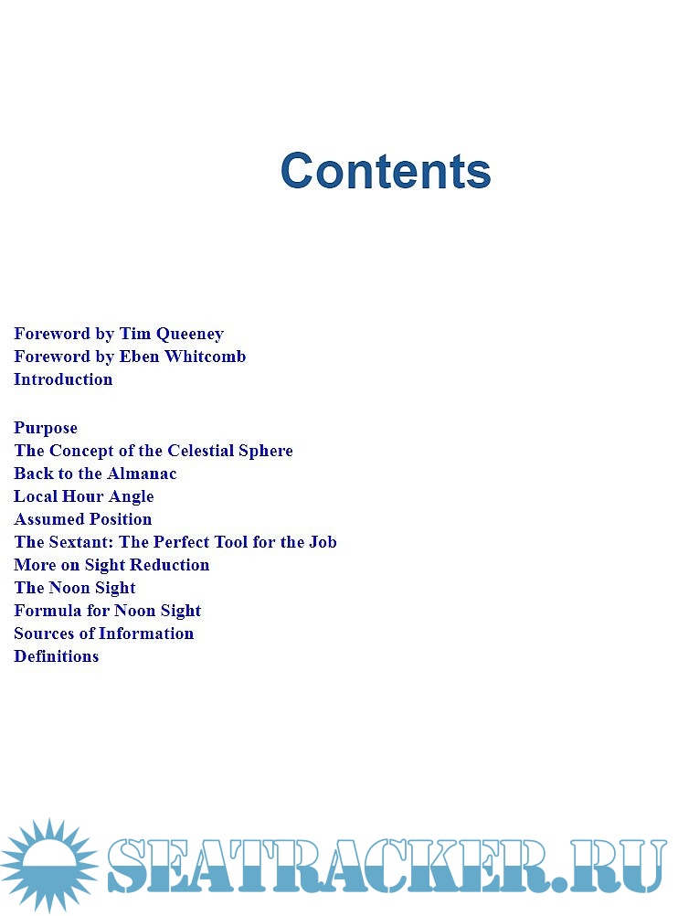 The author, a columnist for Ocean Navigator magazine and a sailing instructor, describes, in a concise and clear way, the basics of the celestial navigation; the celestial sphere, the nautical almanac, time and local hour angle, dead reckoning and assumed position, the sextant, sight reduction and use of HO 249 tables, the noon sight.