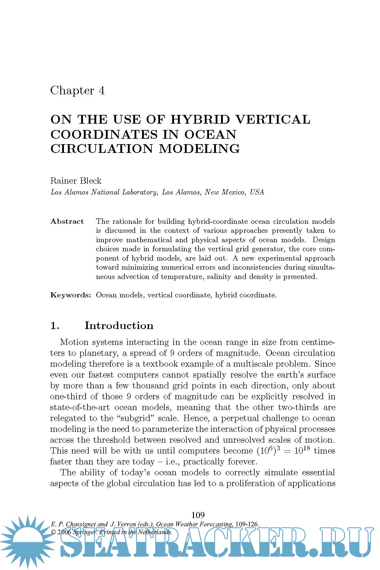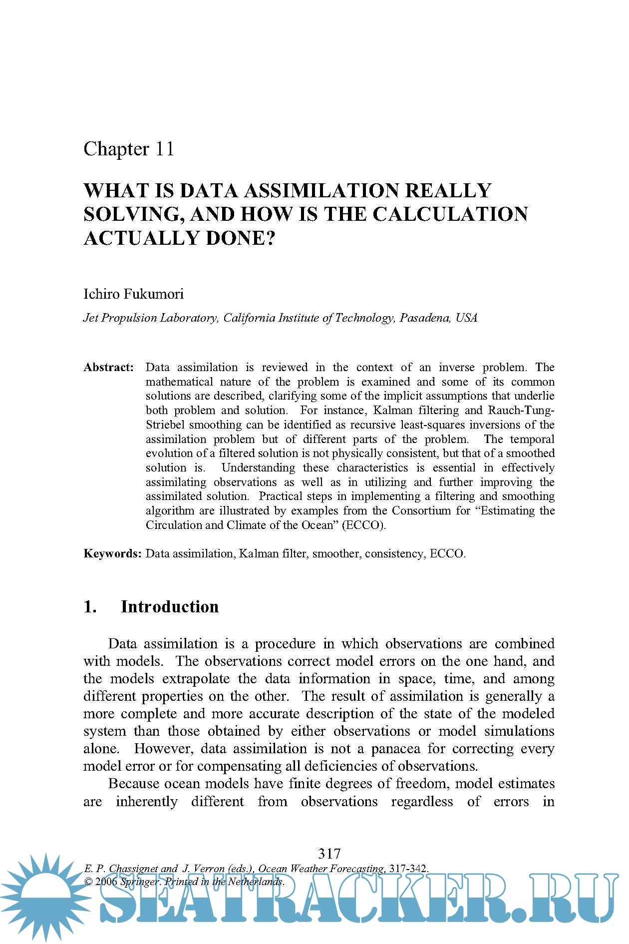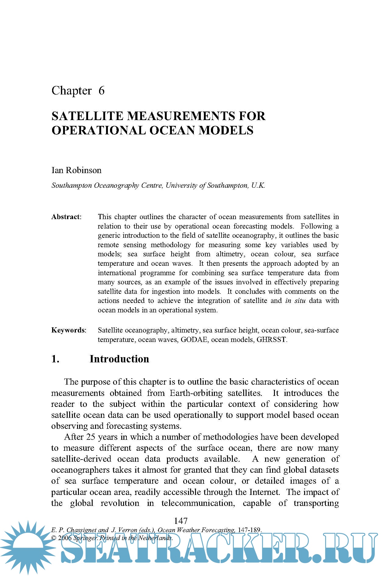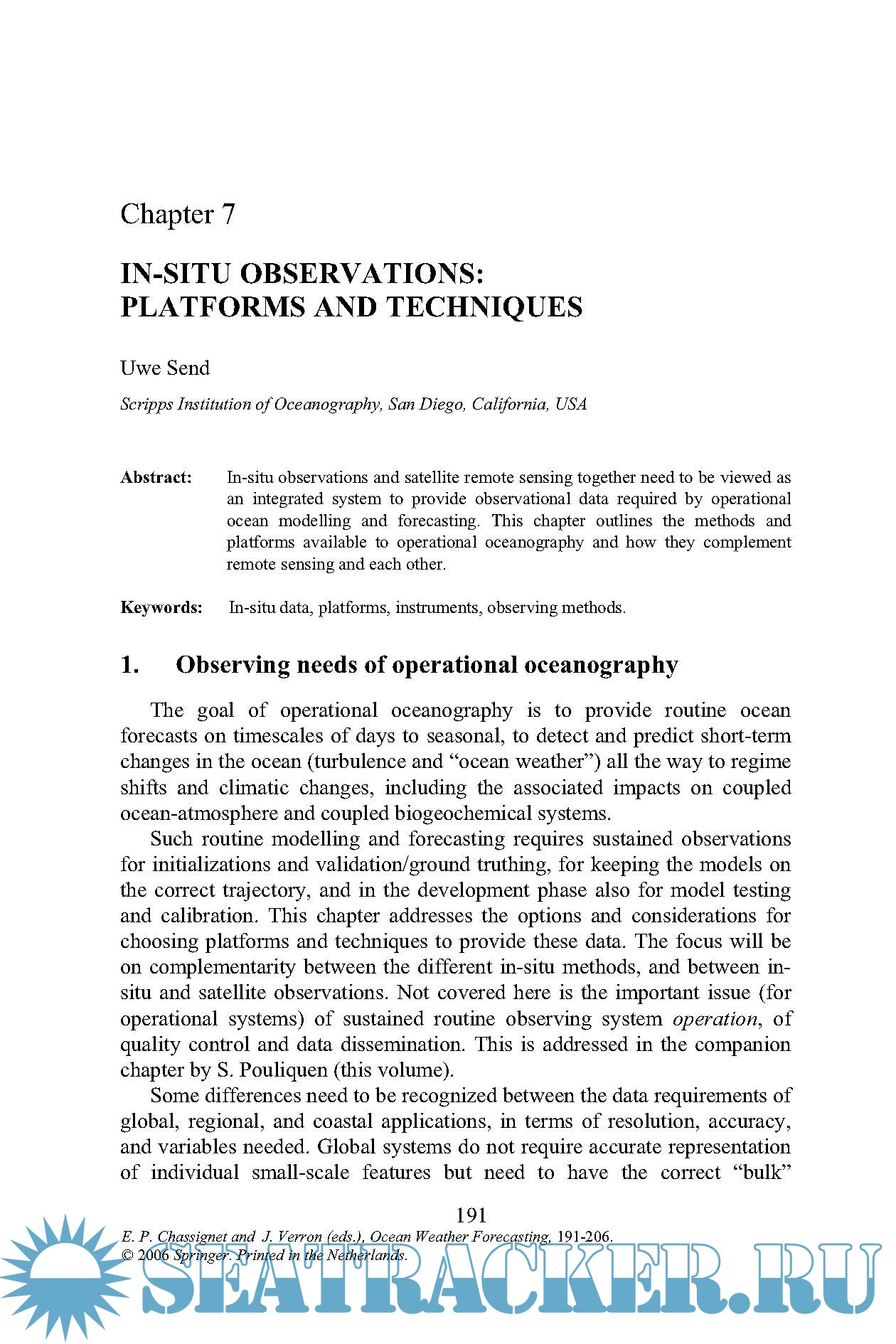 Year: 2006 Language: english Author: Eric P. Chassignet and Jacques Verron (ed.) Genre: Handbook Publisher: Springer ISBN: 978 10 1-4020-4028-8 Format: PDF Quality: eBook Pages count: 573 Description: The field of physical oceanography has matured to a point where it is now conceivable to combine numerical models and observations via data assimilation in order to provide ocean prediction products on various spatial and time scales. As a result, many nations have begun large-scale efforts to provide routine products to the oceanographic community and started to develop operational oceanography systems. The Global Ocean Data Assimilation Experiment (GODAE) provides a framework for these efforts, i.e., a global system of observations, communications, modelling, and assimilation that will deliver regular, comprehensive information on the state of the oceans, in a way that will promote and engender wide utility and availability of this resource for maximum benefit to the community. The societal benefit of this experiment will be an increased knowledge of the marine environment and ocean climate, predictive skills for societal, industrial, and commercial benefit and tactical and strategic advantage, as well as the provision of a comprehensive and integrated approach to the oceans. We therefore considered it timely, given the international context, to bring together leading scientists, system developers, and application providers to present an integrated view of oceanography. The chapters collected in this volume cover a wide range of topics and summarize our present knowledge in ocean modelling, ocean observing systems, and data assimilation.