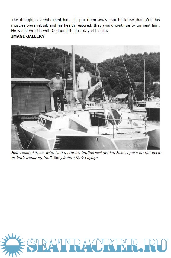 In July 1973, Bob Tininenko; his wife, Linda; and his brother in-law, Jim Fisher, set sail from Tacoma, Washington, on a thirty-one-foot trimaran down the West Coast to Costa Rica. The journey was expected to take a matter of weeks, but ten days into the cruise, the party encountered a freak storm off the coast of northern California. When gale-force winds and fifty-foot waves capsized their boat, the voyage became a nightmare.