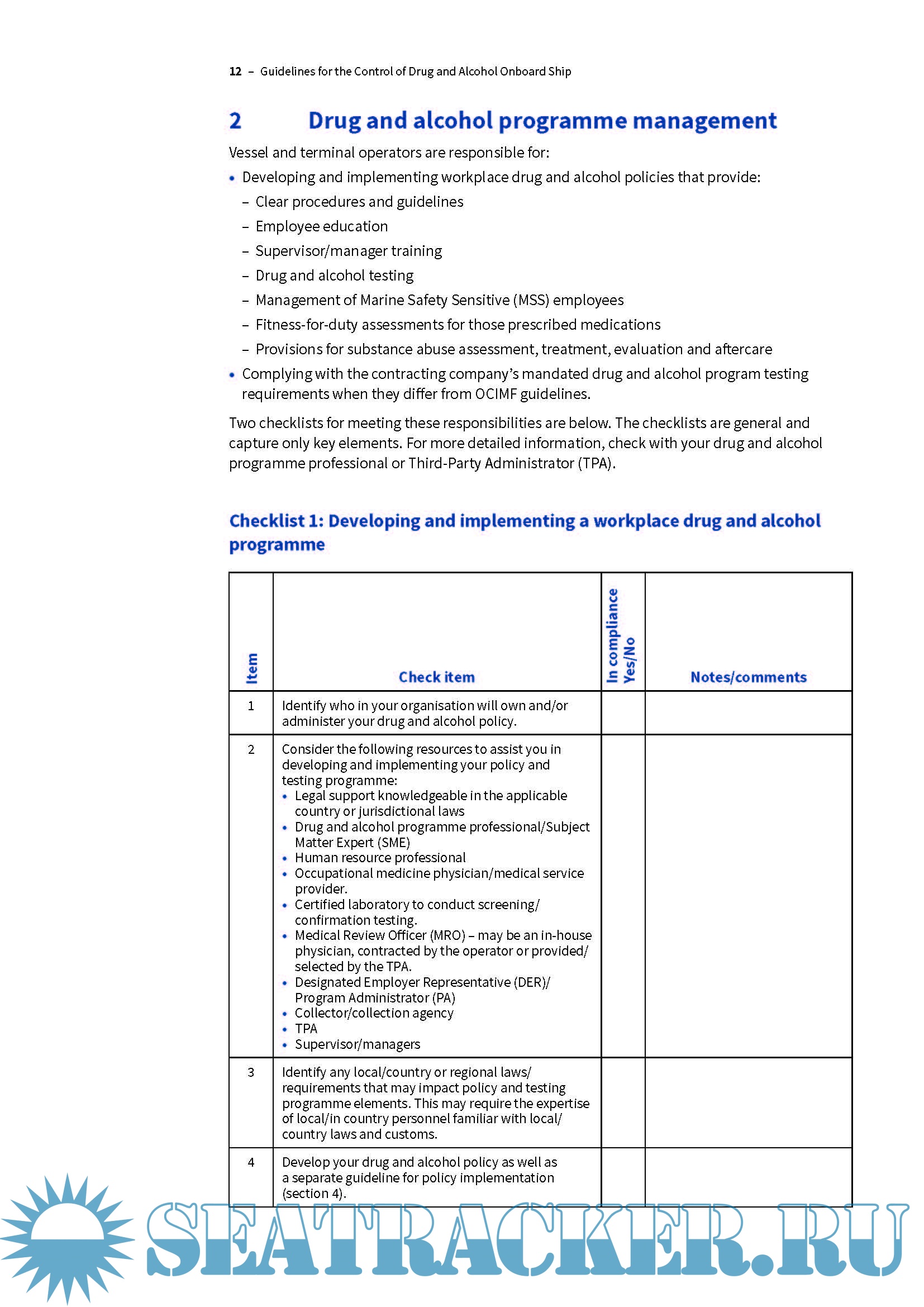 Description: Oil and gas companies in contract with vessel and terminal operators can refer to this guideline for their drug and alcohol programme requirements. Vessel operators and marine terminal operators can use it to meet the OCIMF guidelines.