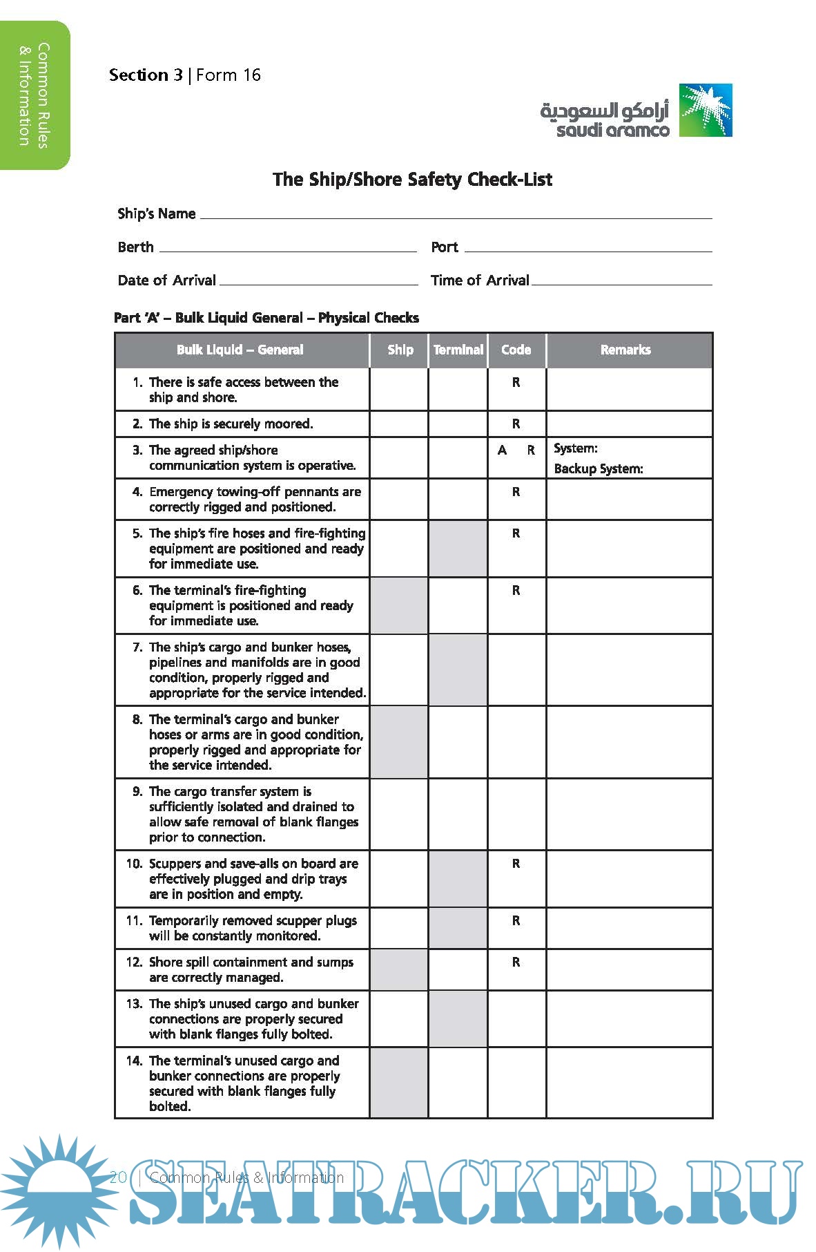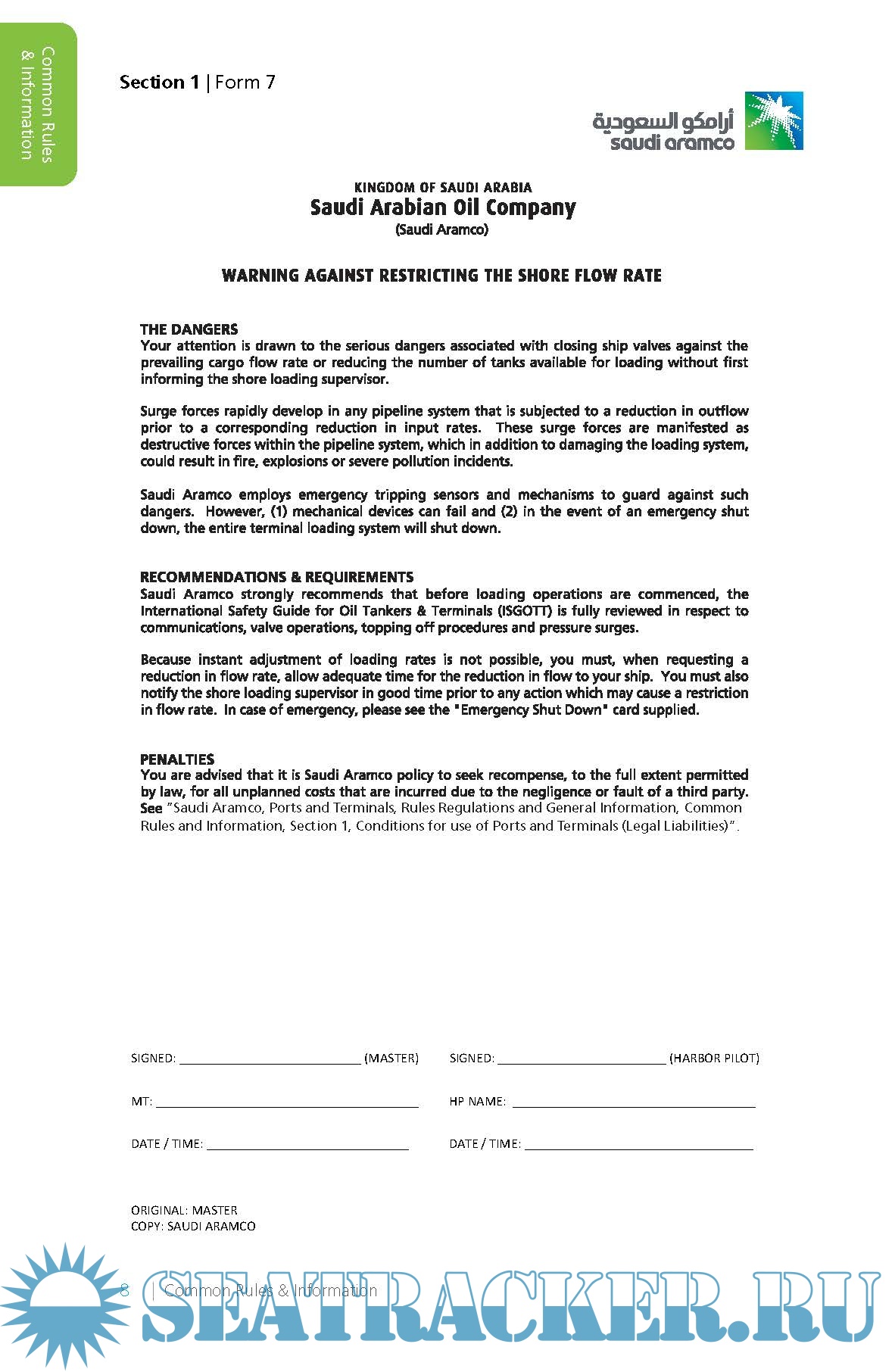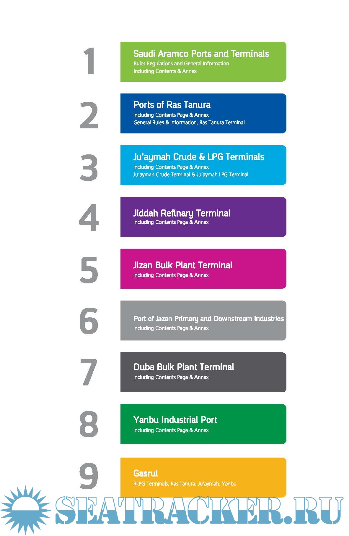 Description: This book is designed as a reference work for the purpose of acquainting Owners, Charterers, Masters of vessels and others with the general conditions, rules, regulations, facilities and available services at all Saudi Aramco Terminals. Every vessel which arrives at any Saudi Aramco Port or Terminal must have a copy of this book on board which is obtainable through the vessel’s agent. Every Master wishing to berth at any Saudi Aramco port or terminal must contract to comply with all the rules and regulations contained herein. This book does not replace or modify official publications covering the waters, areas, hazards or other subjects to which it pertains, nor is it intended for such purposes. The information contained herein is believed to be accurate at the time of going to press but Saudi Aramco makes no warranties and assumes no responsibilities regarding this book or any other information which may appear in supplemental publications, additions or corrections supplied by Saudi Aramco.
