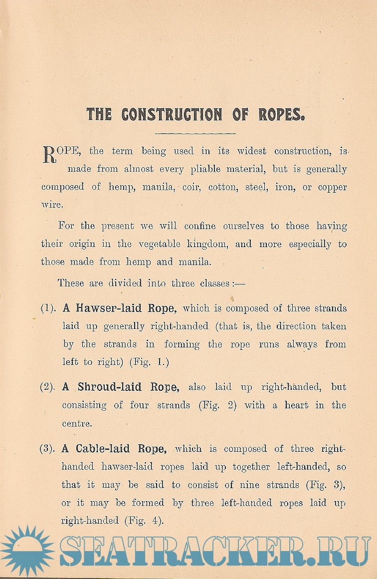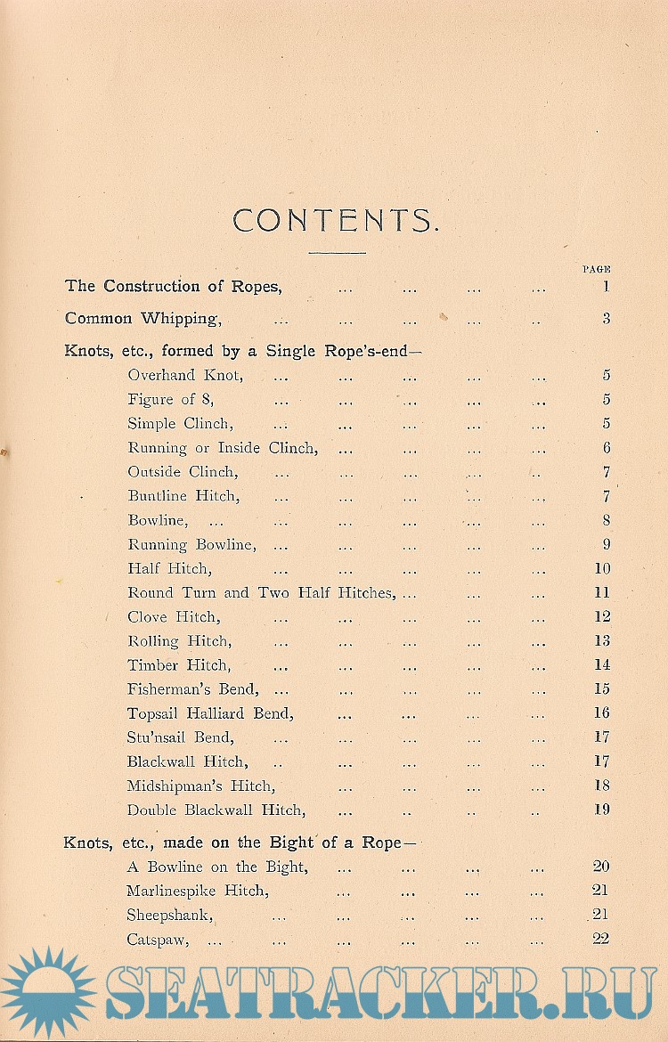 Year: 1912 Language: english Author: J. Netherclift Jutsum Genre: Handbook Publisher: James Brown & Sons Format: PDF Quality: Scanned pages Pages count: 99 Description: This handbook presents, in a compact form and systematic order, a complete list of all the most useful and important workings connected with cordage, and a lucid explanation of their various formations. The explanations of some of the elementary knots may be considered, by even a short experience seaman, almost unnecessary minuteness, but the aim throughout has been to render the work of value to those who approach the subject for the first time. To attain this end, diagrams are introduced at every stage, and if followed closely step by step, in conjunction with the text referring to them, the learner should have no difficulty in following their construction.