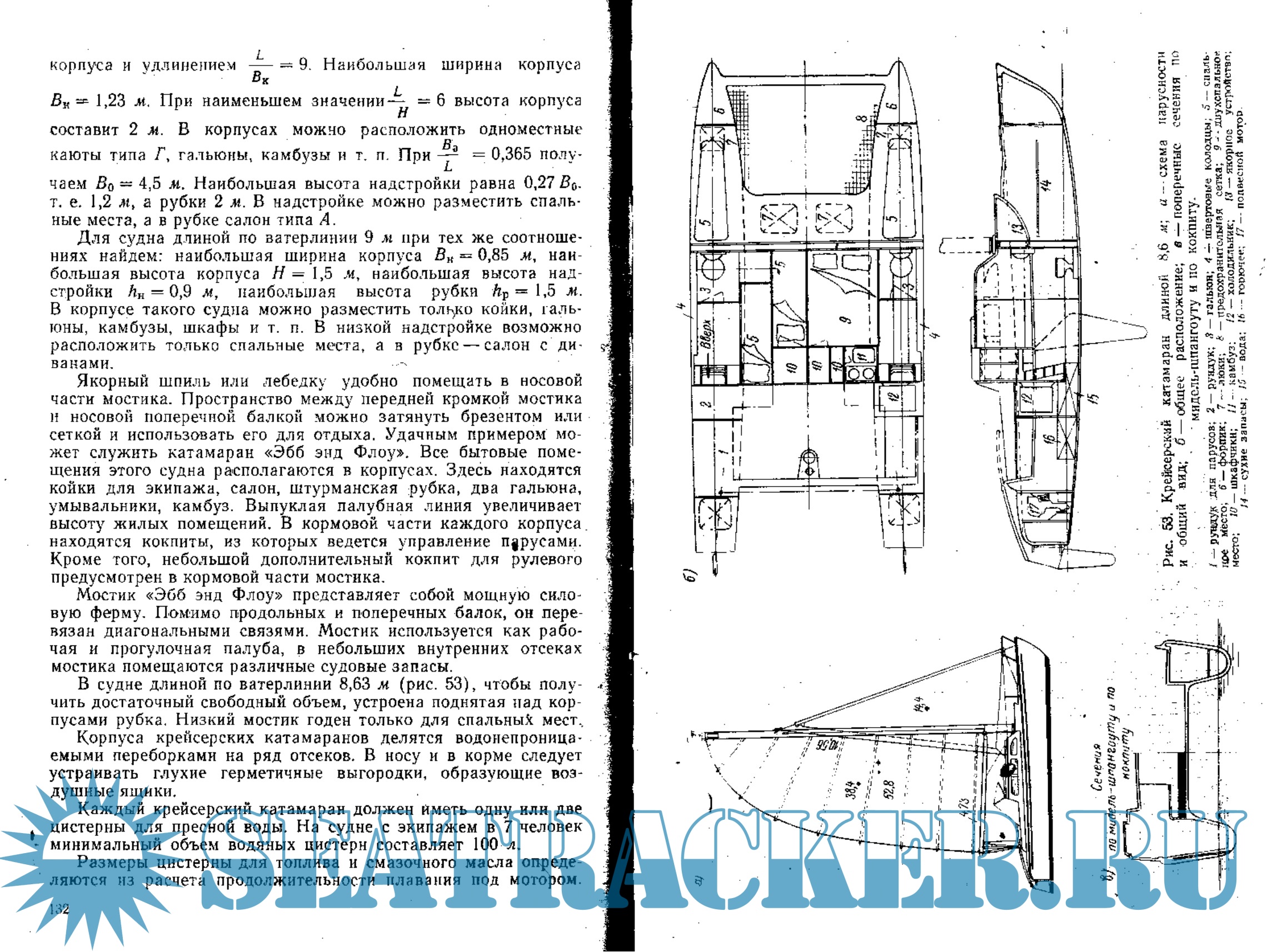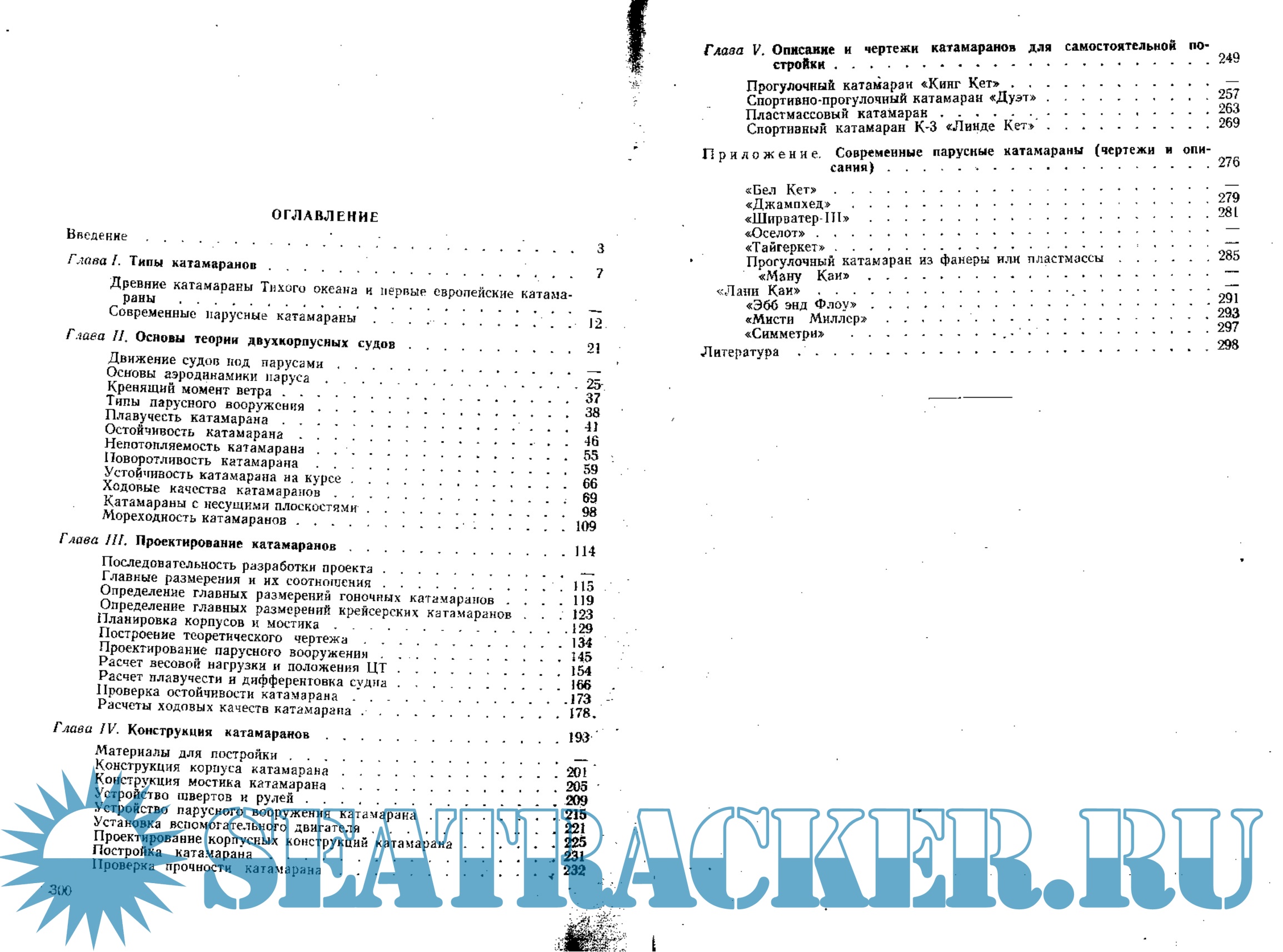 Специальные главы посвящены вопросам движения быстроходных парусных судов и парусному вооружению катамаранов. Дано подробное описание и помещены детальные чертежи четырех катамаранов для любительской постройки. В заключение рассмотрено несколько типов современных спортивных, прогулочных и крейсерских катамаранов; приведены их основные чертежи.