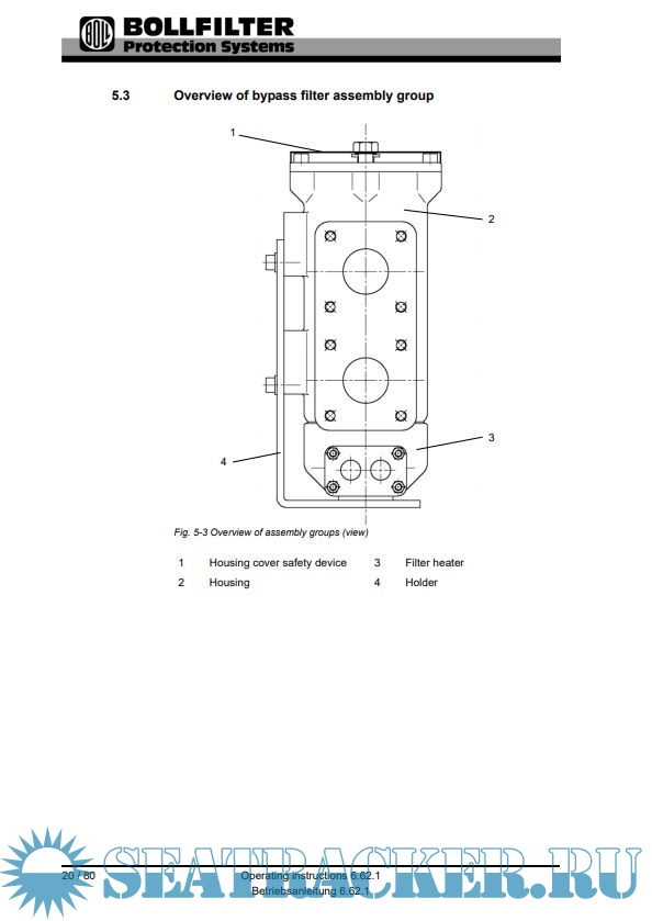 Description: These operating instructions are designed to make it easier to get to know the BOLL & KIRCH filter and make use of its proper intended uses. The operating instructions contain all important instructions on how to operate the filter safely, properly and economically. Adherence to the operating instructions helps to prevent hazards, repair costs and reduce down times and increase the reliability and even the serviceable life of the filter. Read the operating instructions carefully and attentively. Supplement the operating instructions with any instructions required due to existing national and international regulations for the prevention of accidents and environmental protection. Make sure that the operating instructions are always available in the place of use for the filter. The operating instructions must be read and applied by every person given the task of performing the following work:
