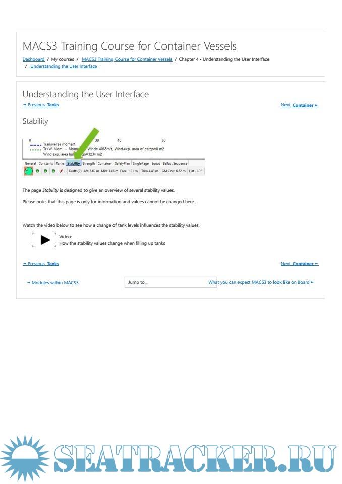 The way you receive information in this course varies between text, images, short explanatory videos, and the fully functional MACS3 container ship training software.
