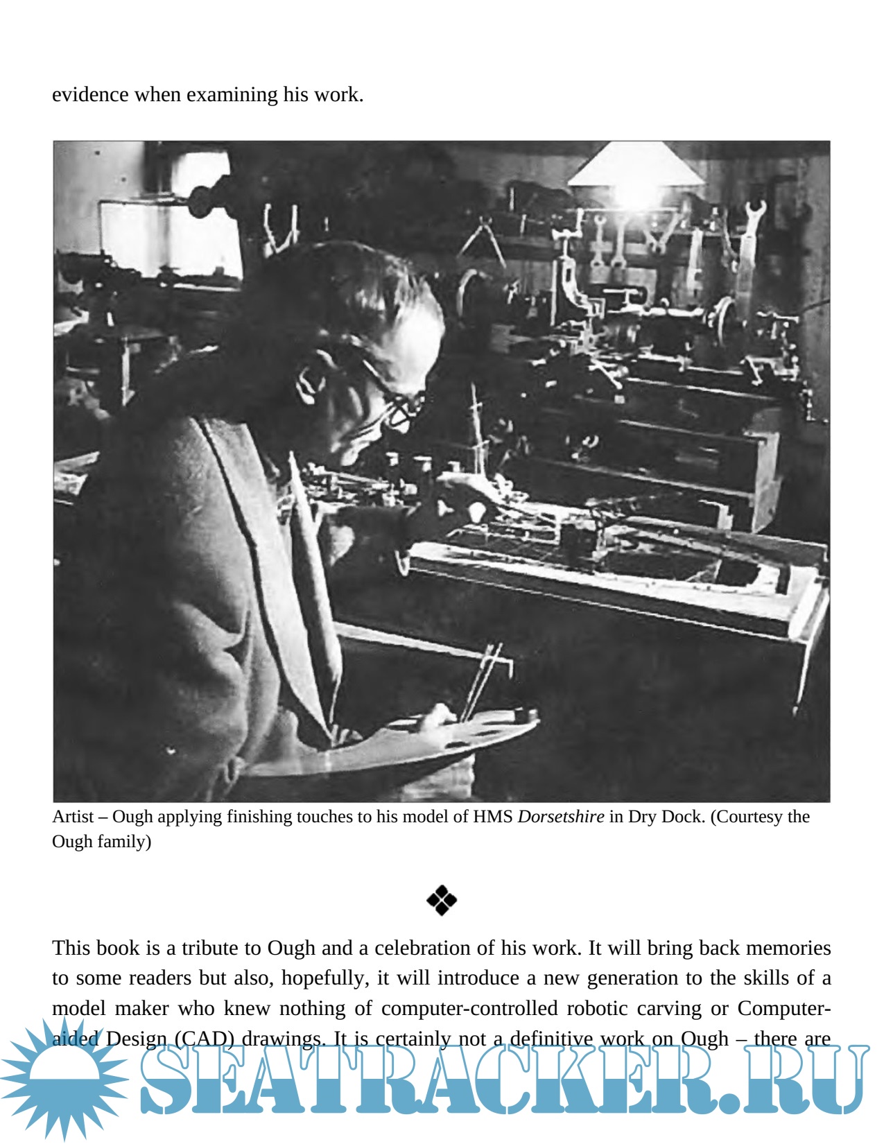 This new book is both a tribute to his lonely genius and a practical treatise for model shipwrights. Ough lived most of his adult life far from the sea in an apartment in London, where his frugal existence and total absorption in his work led to hospitalization on at least two occasions. He was an eccentric in the truest sense but he also became one of the most sought-after masters of his craft. Earl Mountbatten had him model the ships he had served on and film production companies commissioned models for effects in several films.