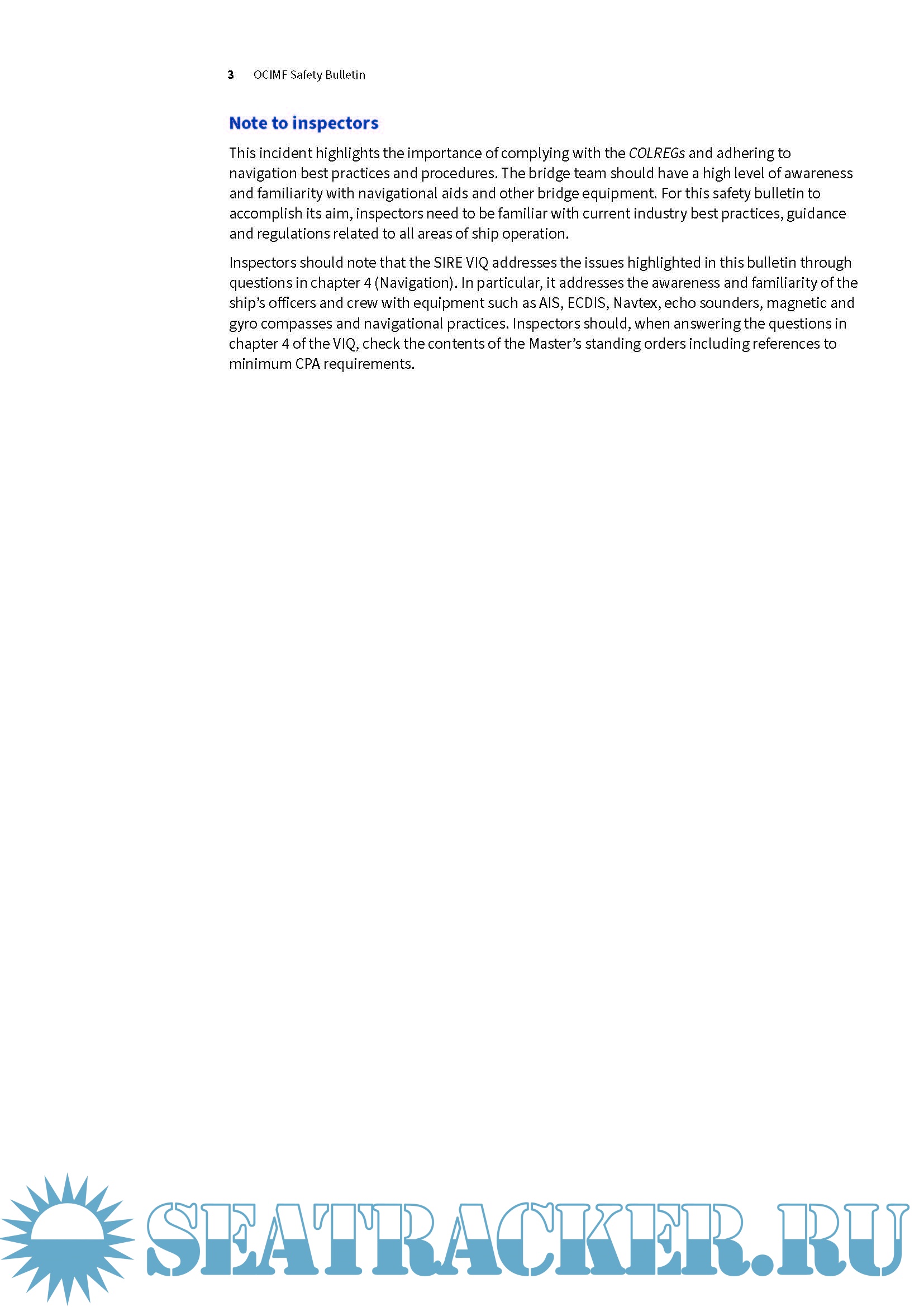 Description: This safety bulletin highlights the importance of verifying the level of awareness and familiarity vessel personnel have with key learnings, procedures and regulations affected by this incident. This safety bulletin is based on facts, contributory factors and learnings identified in the official investigation report of the collision between the Sanchi and the CF Crystal. It is also based on an analysis by OCIMF members of information available from the official reference documents. This safety bulletin does not in anyway seek to apportion blame or liability for the incident.