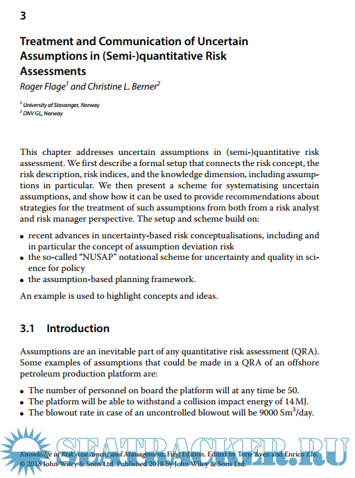 Year: 2018 Language: english Author: Terje Aven & Enrico Zio Genre: Reference book Publisher: John Wiley & Sons Ltd Format: PDF Quality: OCR without errors Pages count: 346 Description: This book is about knowledge in risk assessment and management.