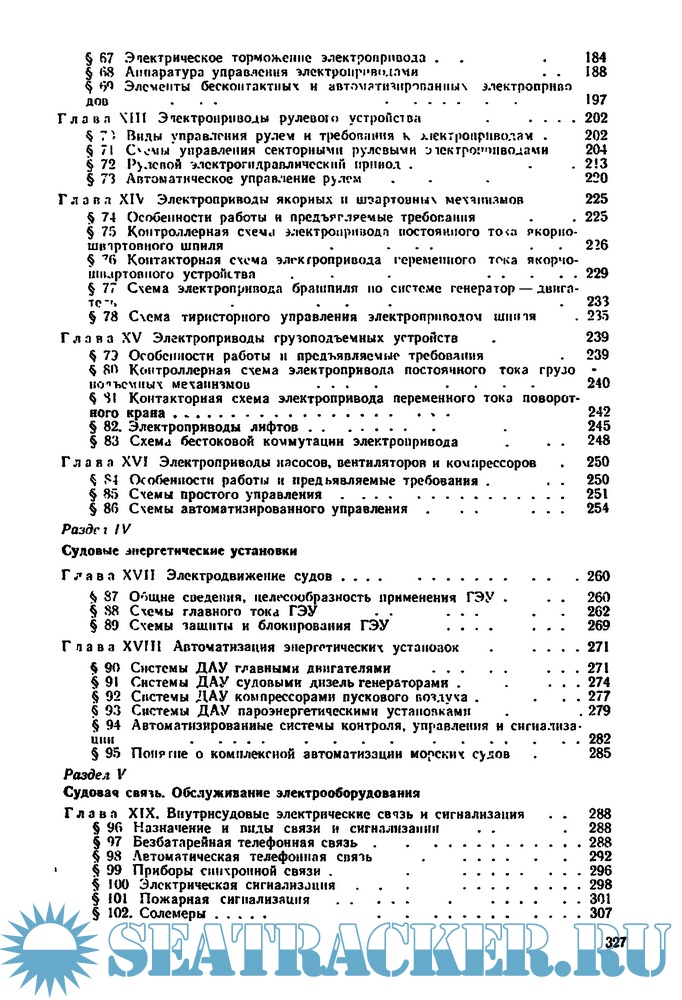 Уделено внимание гребным электрическим установкам, внутрисудовой электрической связи и сигнализации; дано понятие о средствах радиосвязи, радионавигации и электронавигации морских судов.