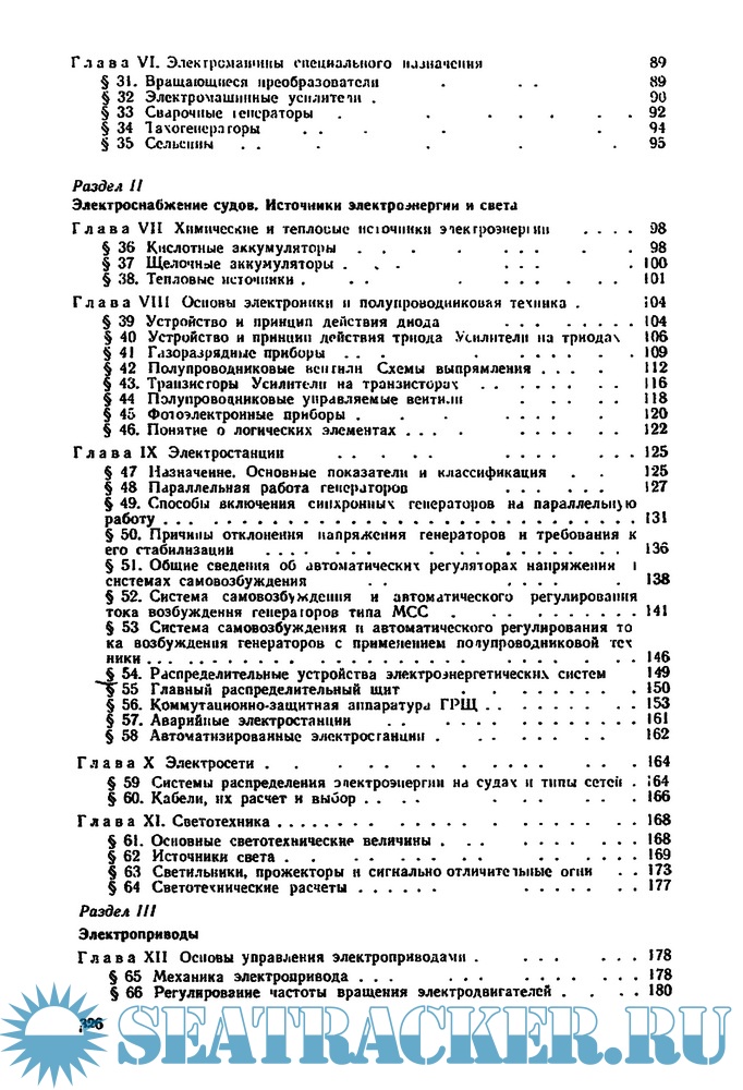 B книге изложены принципы действия, устройство и основные характеристики судовых электроизмерительных приборов, электрических машин и трансформатopoв, химическиx и тепловых источников электроэнергии, электровакуумных, ионных и полупроводниковых приборов, аппаратуры различных электрическиx схем. Рассматриваются судовые электрические станции и их системы, схемы современных электроприводов, принципы автоматизированного и дистанционного управления судовой энергетической установкой, ее отдельными узлами и системами.