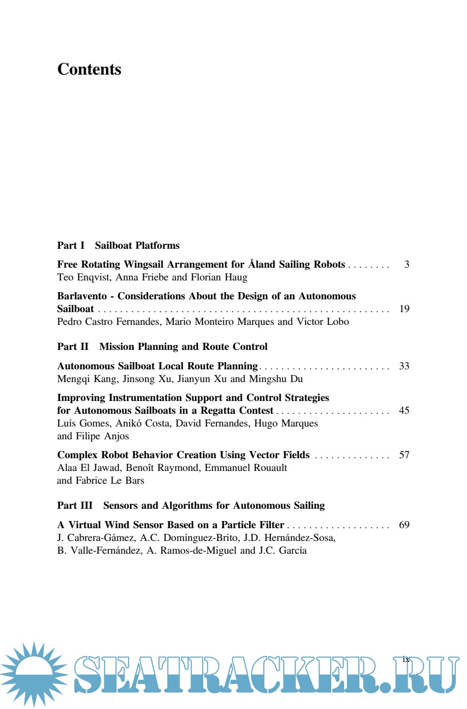 The book is divided in three parts, each focusing on key aspects of robotic sailing. The first part addresses the design, construction and validation of autonomous sailboat platforms, including their rigs, appendages and control mechanisms. The second part is devoted to the development of sensors and algorithms to enhance the performance of robotic sailing boats, in terms of their speed, course control and manoeuvring ability. Finally, the papers in the last part are dedicated to the improvement of behaviours required for the accomplishment of complex autonomous missions.