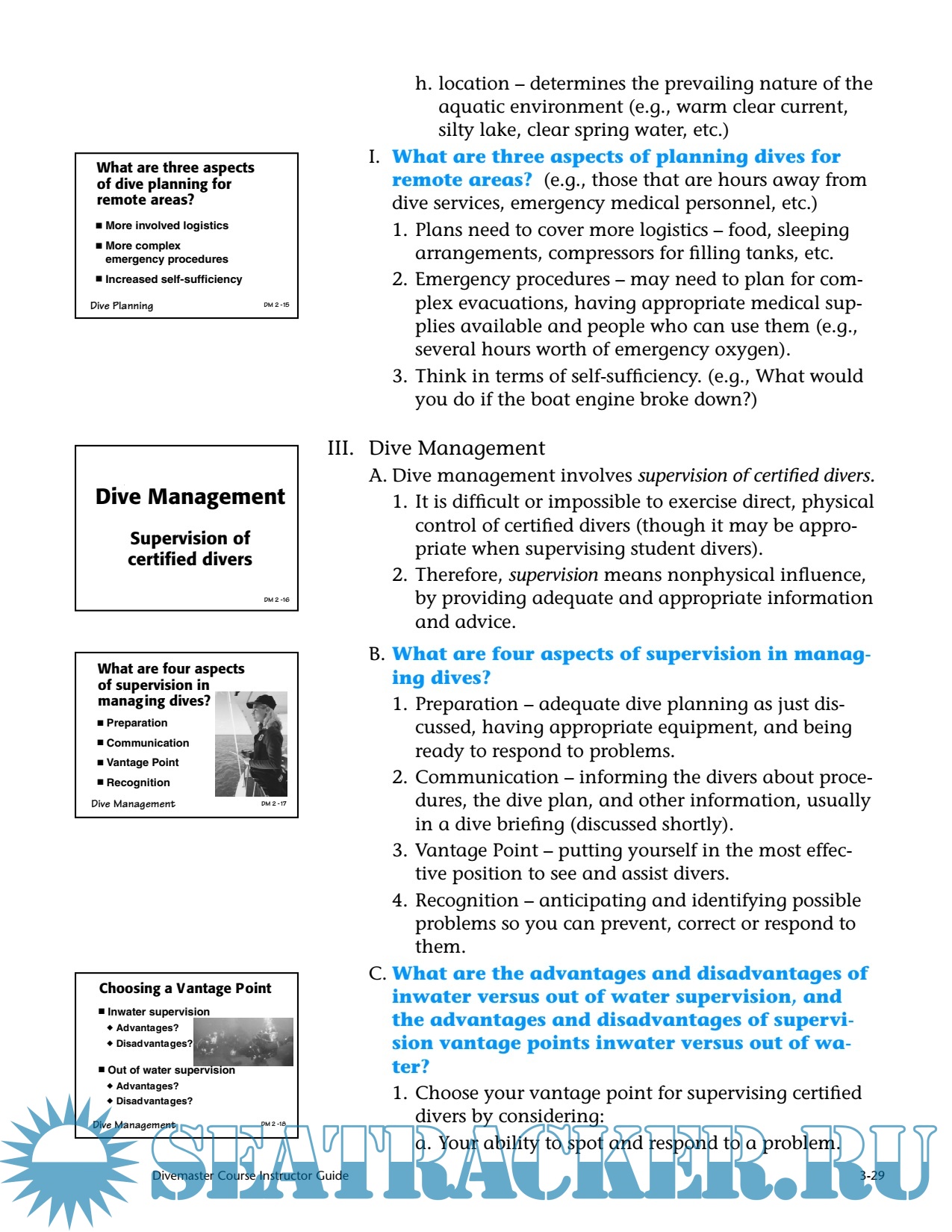 Year: 2004 Language: english Author: Professional association of diving instructors Genre: Guide Publisher: Professional association of diving instructors Format: PDF Quality: Scanned pages Pages count: 220 Description: The PADI Divemaster course teaches you to be a leader and take charge of dive activities. Through knowledge development sessions, waterskills exercises and workshops, and hands-on practical assessment, you develop the skills to organize and direct a variety of scuba diving activities.