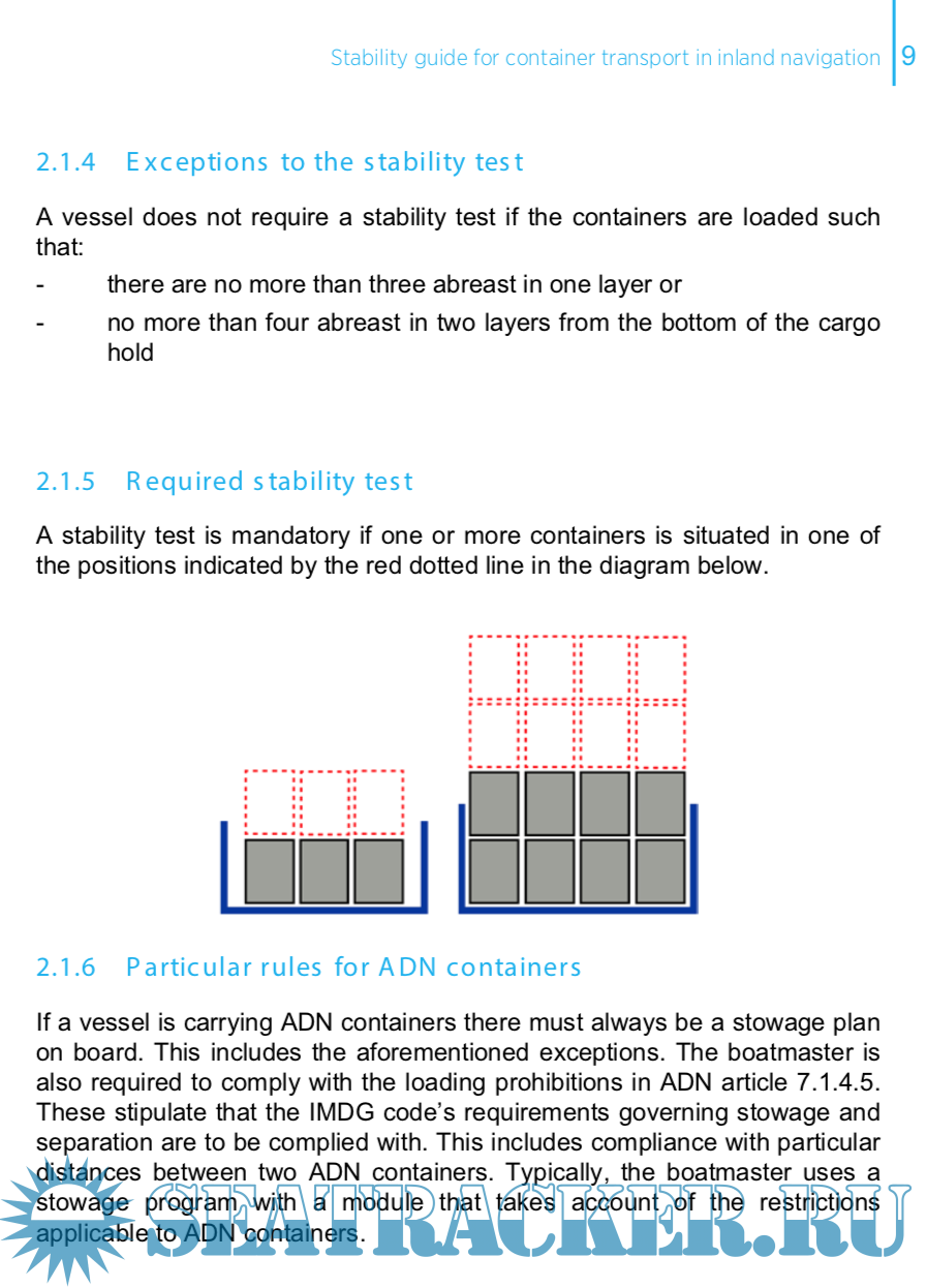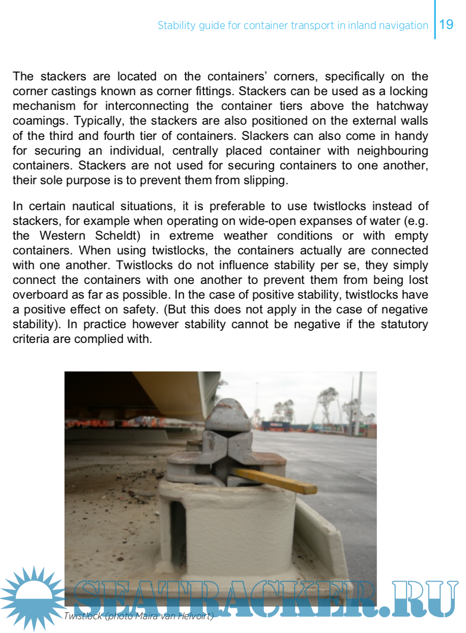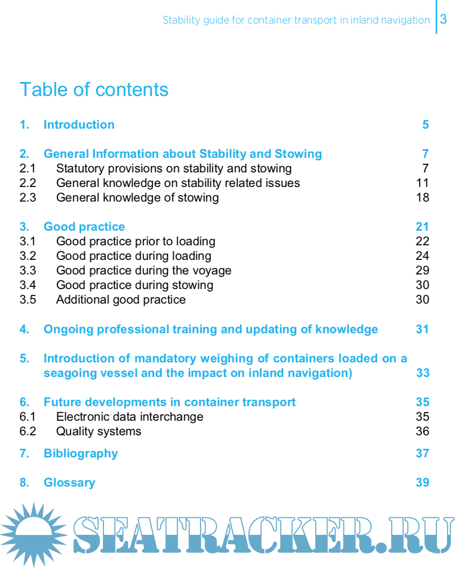 Year: 2017 Language: english Author: The Central Commission for the Navigation of the Rhine (CCNR) Genre: Guide Publisher: The Central Commission for the Navigation of the Rhine (CCNR) Format: PDF Quality: eBook Pages count: 42 Description: Container transport by inland waterway vessel is a particularly safe form of transport. Every year, millions of containers are transported safely and sustainably between the seaports on the one hand and hinterland terminals along the Rhine and other inland waterways on the other hand. Nevertheless, there have been a number of accidents in recent years from which lessons can be learned. For example, in the spring of 2007 the Excelsior lost 31 containers, resulting in the Rhine being completely closed to navigation for more than a week. Also in the spring of 2007, 30 containers were lost overboard by the Arc-en-Ciel on the Seine, bringing navigation to a halt for a week. The Ferox capsized in Rotterdam in 2006. The examples mentioned go to show that notwithstanding the fact that container transport is very safe, accidents do occur, which are attributable to stability defects. Stability defects can have a number of causes: incorrect stowage, incorrect information, for example about container weights, but insufficient knowledge of stability-related parameters may also play a role. Stability is indeed part and parcel of inland waterway boatmen’s general training but it bears pointing out that ensuring that all inland navigation crews’ level of knowledge is kept up to the mark at all times is an important task. With this in mind, the industry (ESO, EBU), Aquapol and CCNR have decided to publish this guide to good practice. This guide illustrates in an easy-to-remember way the basic principles of stability and tried and tested real-life examples with a positive impact on stability