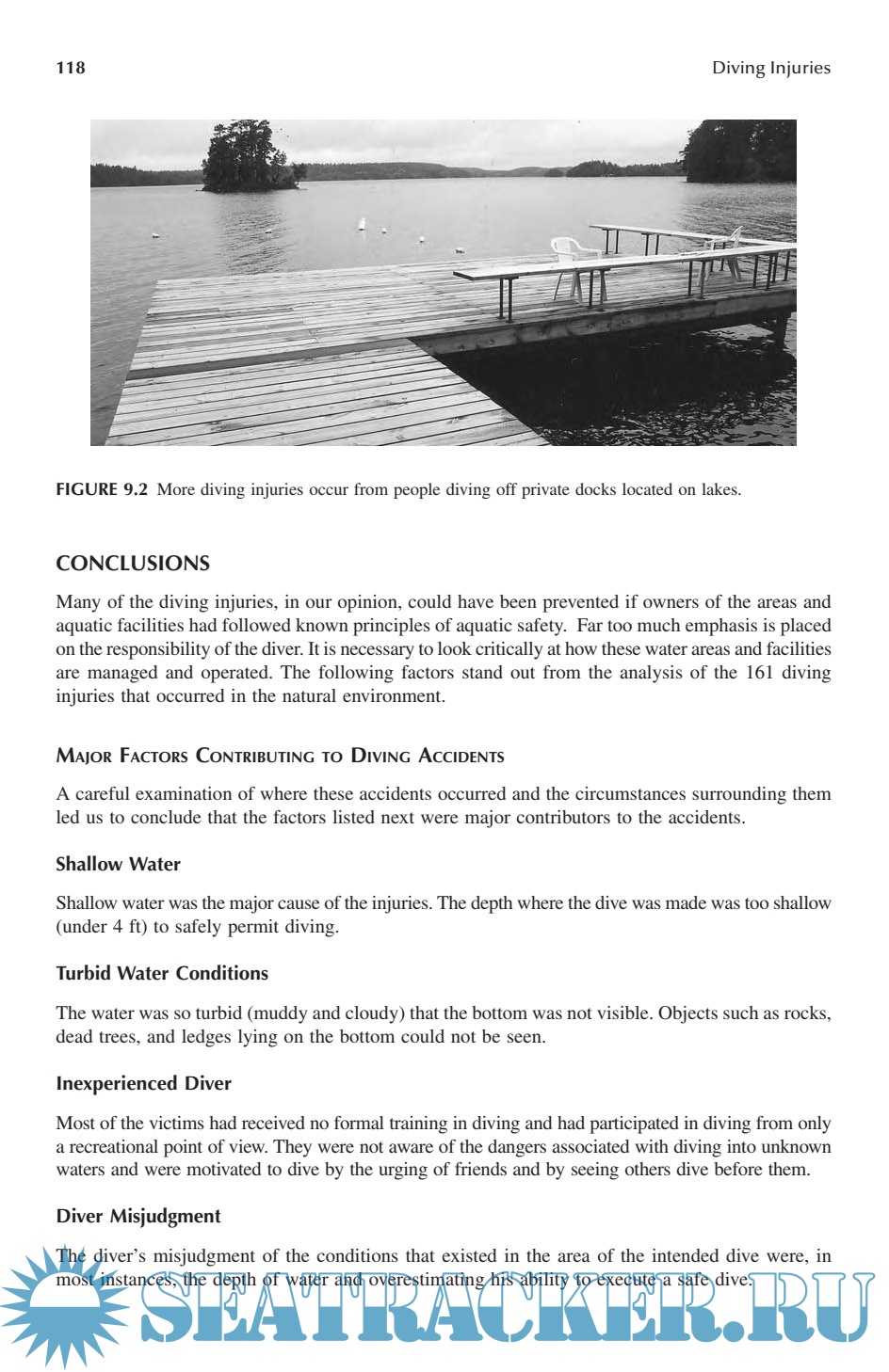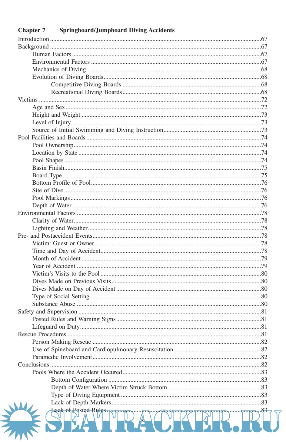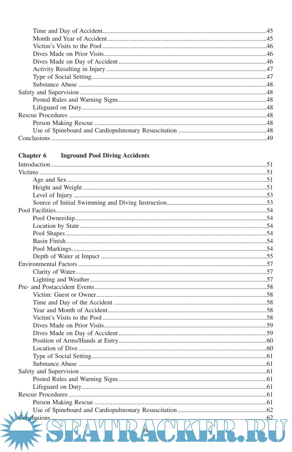 Year: 2000 Language: english Author: Gabrielsen M. Genre: Manual Publisher: CRC Press Edition: 1st ISBN: 0849323703 Format: PDF Quality: Scanned pages Pages count: 273 Description: Diving Injuries: Research Findings and Recommendations for Reducing Catastrophic Injuries represents the most comprehensive study ever done on the problem of spinal cord injuries resulting from diving into water. ng injuries. In it, Dr. Gabrielsen, a renowned expert on the interpretation and presentation of diving-related testimony, discusses injuries sustained in swimming pools, lakes, rivers, and oceans; the laws, standards, and regulations for swimming pool design; and the cost of medical and rehabilitative care for spinal cord injury victims. The book provides a greater understanding of diving safety from all perspectives and is an indispensable reference guide to the safety conscious.