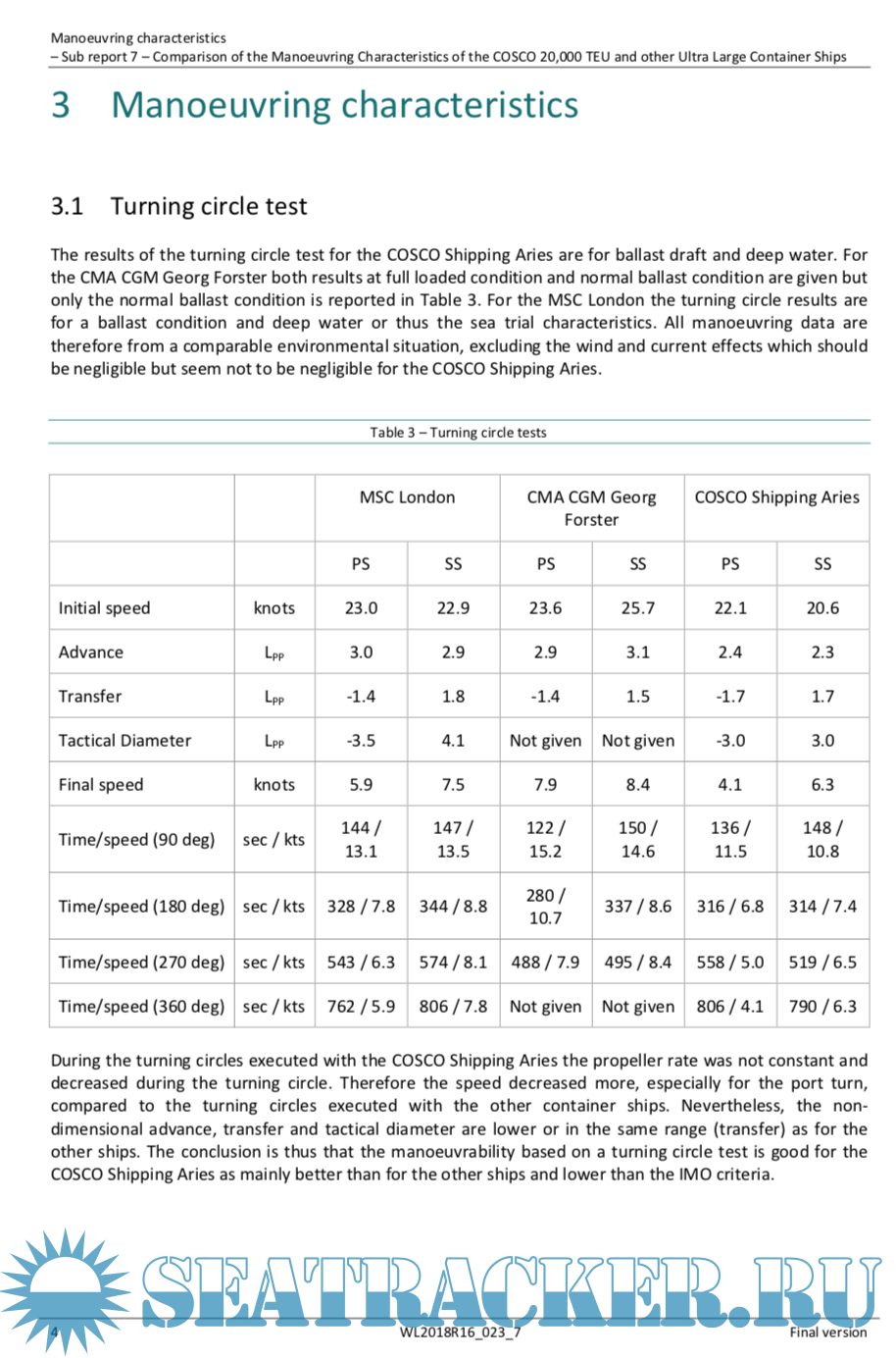 Manoeuvring characteristics Sub report 7 Comparison of the Manoeuvring Characteristics of the COSCO 20,000 TEU and other Ultra Large Container Ships