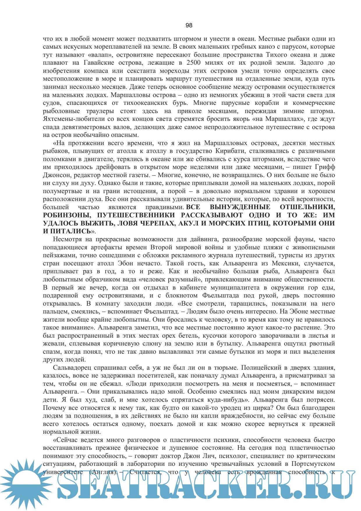 Описание: Как долго можно выжить в открытом море, без средств связи, еды и пресной воды? Неделю? Месяц? Год?... Опытный рыбак на акул Альваренга и его помощник 22-летний мексиканец Кордоба отправились ловить акул, но попали в жуткий шторм. Мотор вышел из строя, и их лодку унесло в открытый океан. Без еды, снастей и пресной воды им только и оставалось как дрейфовать на волнах и надеятся на чудо... А ровно через 438 дней жители атолла Эбон, входящего в состав Маршалловых островов и находящегося в 10 000 километров от Мексики, заметили рядом со своим жилищем худого мужчину в разодранной одежде и обросшего густой бородой... Эта история так поразительна, что некоторые до сих пор не верят в ее подлинность. Но правда порой оказывается гораздо невероятнее реальности.