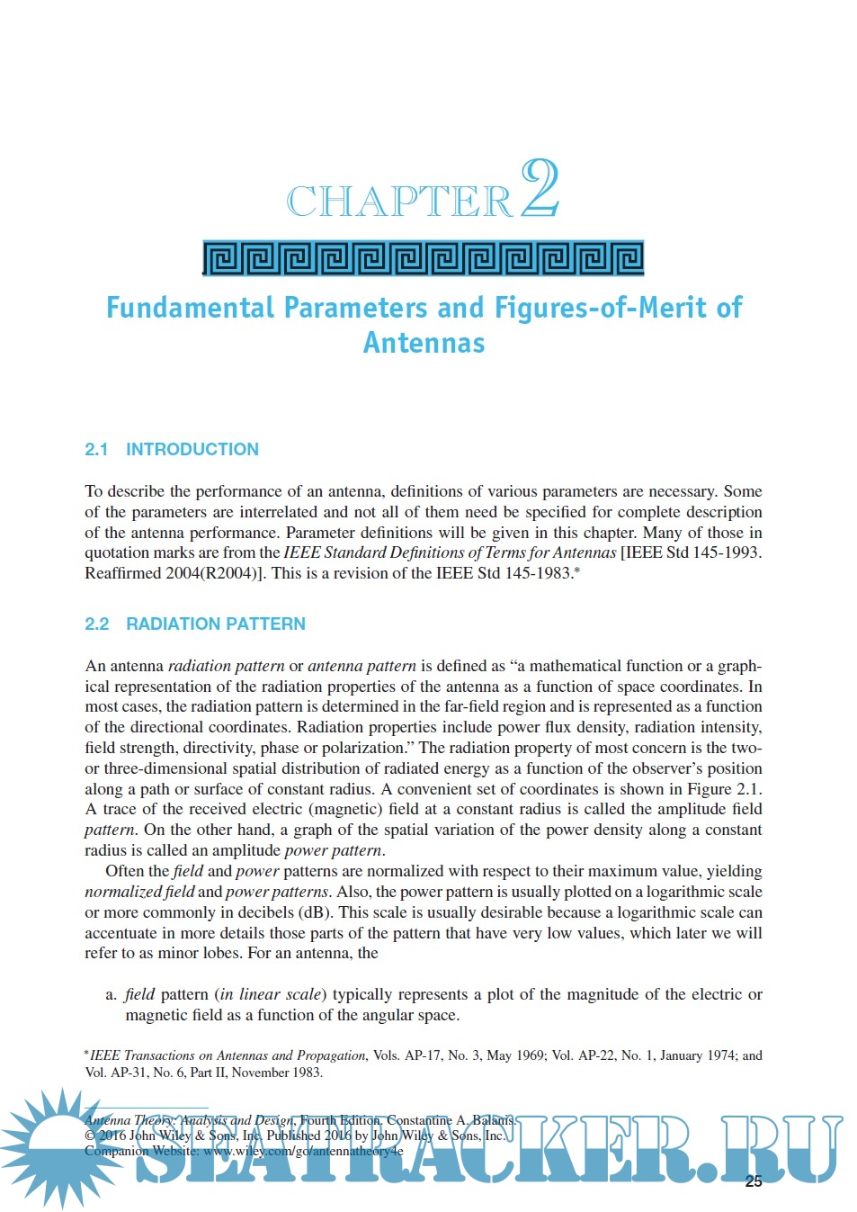 Year: 2016 Language: english Author: Constantine A. Balanis Genre: Manual Publisher: John Wiley & Sons Edition: 4th ISBN: 978-1-5231-1005-6 Format: PDF Quality: eBook Pages count: 1095 Description: This manual is a complete discussion on antennas, introducing the fundamental theory principles and explaining how to apply them. The applications covered in the book are the most basic and practical antenna configurations such as linear dipoles, loops, arrays, broadband and aperture antennas, horns, microstrip antennas, and reflector antennas. The book’s aim is to unify the treatment of the fundamental principles of antenna theory and to apply them to the analysis, design, and measurements of antennas, and also balancing the tendency to present a list of unrelated formulas, and and the risk of appearing a cookbook of practical solutions which apply to a single specific case. An useful feature of the book is a large number of illustrations about three-dimensionalradiation patterns.
