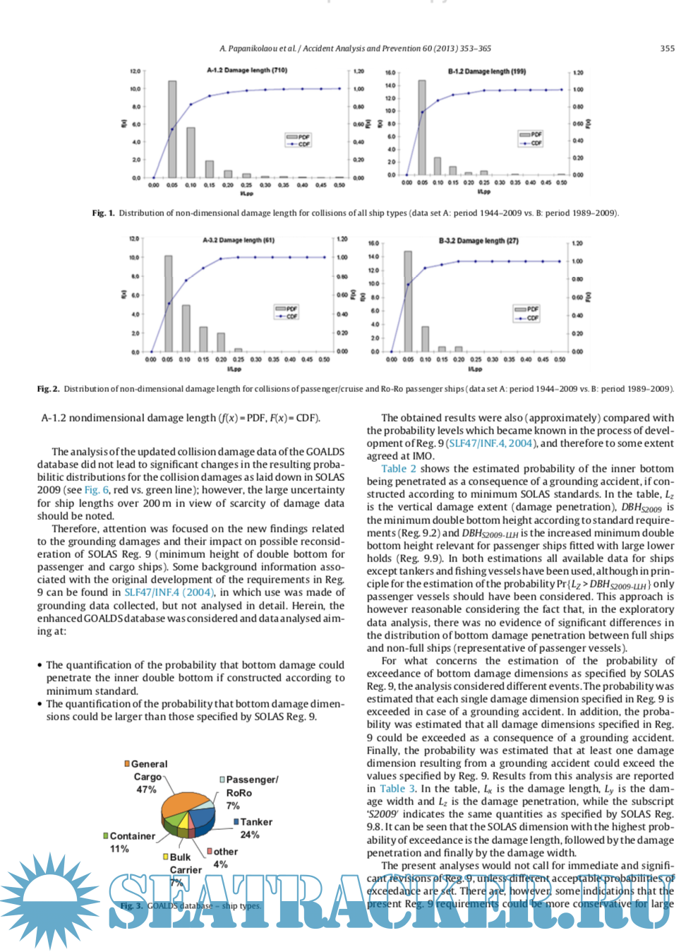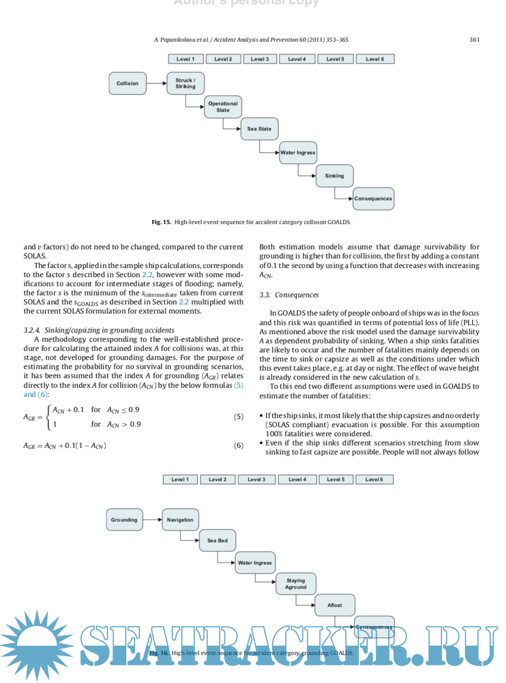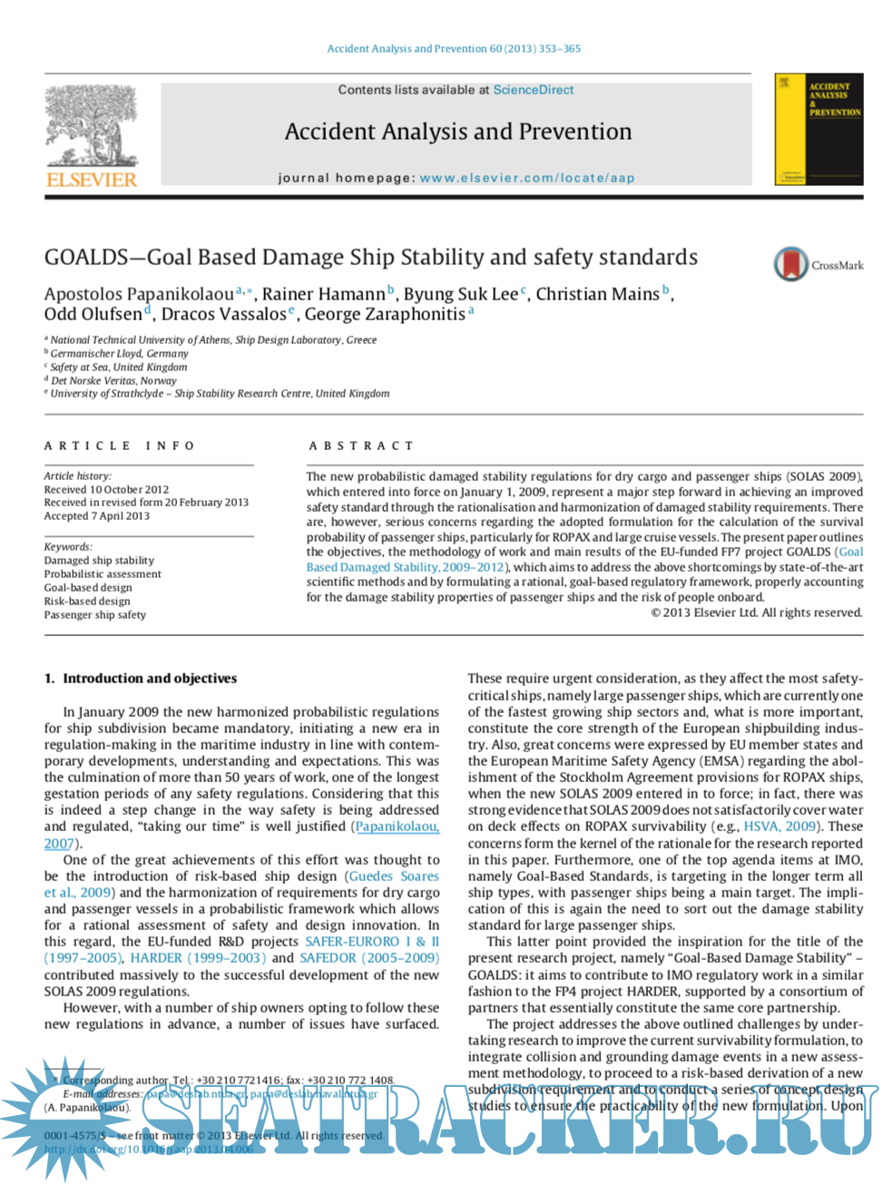 Year: 2013 Language: english Author: Apostolos Papanikolaou et alli Genre: Research papers Publisher: Elsevier Format: PDF Quality: eBook Pages count: 14 Description: The new probabilistic damaged stability regulations for dry cargo and passenger ships (SOLAS 2009), which entered into force on January 1, 2009, represent a major step forward in achieving an improved safety standard through the rationalisation and harmonization of damaged stability requirements. There are, however, serious concerns regarding the adopted formulation for the calculation of the survival probability of passenger ships, particularly for ROPAX and large cruise vessels. The present paper outlines the objectives, the methodology of work and main results of the EU-funded FP7 project GOALDS (Goal Based Damaged Stability, 2009–2012), which aims to address the above shortcomings by state-of-the-art scientific methods and by formulating a rational, goal-based regulatory framework, properly accounting for the damage stability properties of passenger ships and the risk of people onboard.