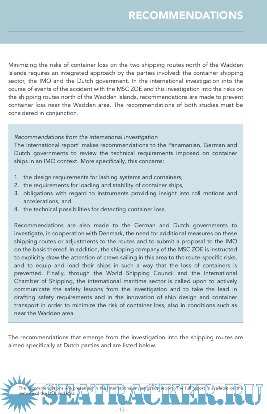 The accident also led the Dutch Safety Board to launch an additional investigation into the route-specific risks on the shipping routes north of the Wadden Islands, which can lead to the loss of containers for large container ships like the MSC ZOE. This report describes the findings of that investigation. The findings from the two investigations into the accident with the MSC ZOE were exchanged and the reports (and recommendations) harmonized.