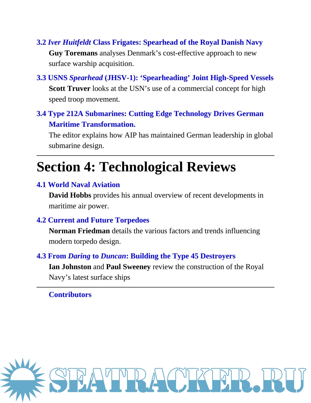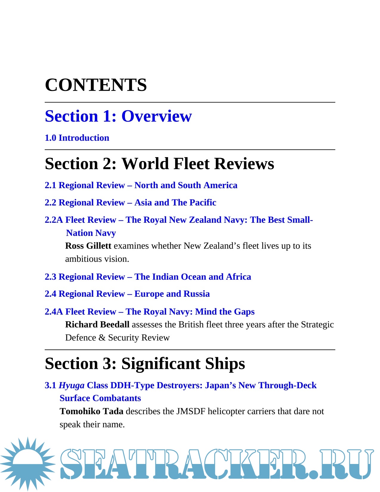 Special features for this year include a survey of current and future torpedo developments, an in-depth study of the Royal New Zealand Navy, a look at how the Royal Navy is coping after the Strategic Defense and Security Review, plus analyses of significant new warship classes: the Japanese Hyuga class DHH concept, the USNS Spearhead Joint Hish-Speed Vessels, Danish Iver Huitfeldt class frigatees, and German AIP technology as demonstrated in the recent Type 212A submarines.