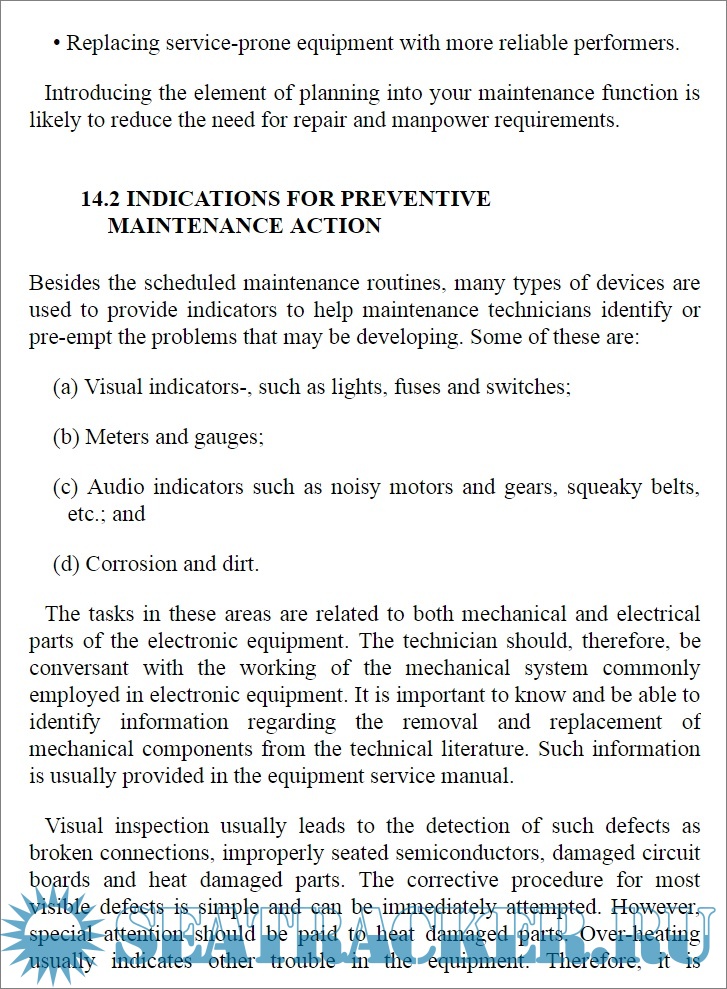 Year: 2007 Language: english Author: R. S. Khandpur Genre: Manual Publisher: McGraw-Hill ISBN: 9780071477314 Format: PDF Quality: eBook Pages count: 522 Description: The reliability of a system is essential in any service, especially on board, where it is frequent to maintain or repair electronic equipment, On the other hand, electronics have changed enormously in recent decades, especially in the field of component miniaturization and their integration. Tiny SMD components are barely visible to the naked eye, and they are difficult or impossible to change or repair. The complexity and interconnection of systems drives to a systems approach to troubleshooting hardware, rather than a components one. This book leads the reader to easy step-by-step procedures for correct identification of the causes of most of the problems occurring in the electronic equipment and methods of repair. It deals with any sort of equipment, from digital to analog electrical circuits, passive and active compomnents, single comonents and integrated circuits, from proper usage of tools and multi-meters to soldering techniques. Many examples are given in the book, specific chapters on reliability aspects of equipment, preventive maintenance, and maintenance management plans are added. Additional info: Both pdf and epub files are provided