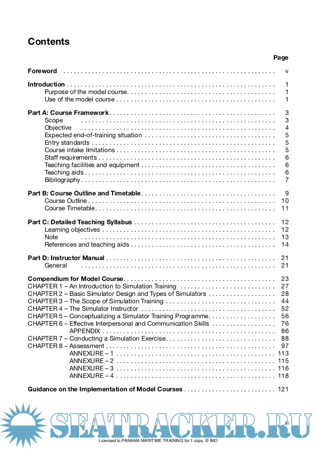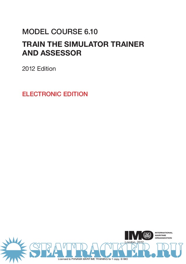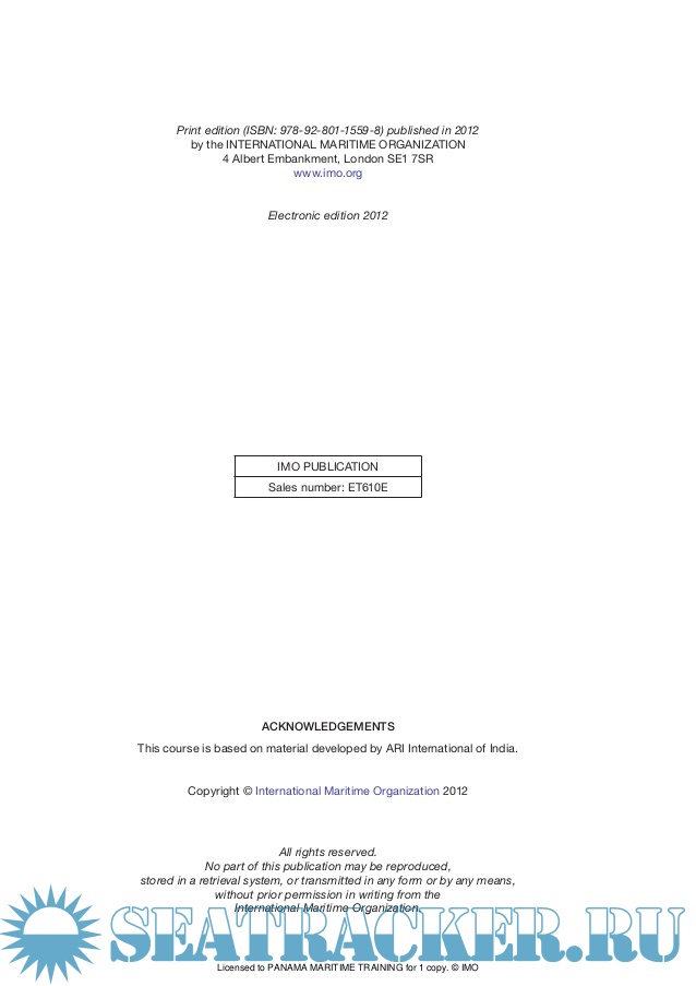 Description: Published in 2012 by the INTERNATIONAL MARITIME ORGANIZATION 4 Albert Embankment, London SE1 7SR www.imo.org Printed by CPI Group (UK) Ltd, Croydon, CR0 4YY ISBN: 978-92-801-1559-8 IMO PUBLICATION Sales number: T610E ACKNOWLEDGEMENTS This course is based on material developed by ARI International of India. Copyright © International Maritime Organization 2012 All rights reserved. No part of this publication may be reproduced, stored in a retrieval system, or transmitted in any form or by any means, without prior permission in writing from the International Maritime Organization. Print edition (ISBN: 978-92-801-1559-8) published in 2012 by the INTERNATIONAL MARITIME ORGANIZATION 4 Albert Embankment, London SE1 7SR www.imo.org Electronic edition 2012 IMO PUBLICATION Sales number: ET610E ACKNOWLEDGEMENTS This course is based on material developed by ARI International of India. Copyright © International Maritime Organization 2012 All rights reserved. No part of this publication may be reproduced, stored in a retrieval system, or transmitted in any form or by any means, without prior permission in writing from the International Maritime Organization. Licensed to PANAMA MARITIME TRAINING for 1 copy. © IMO