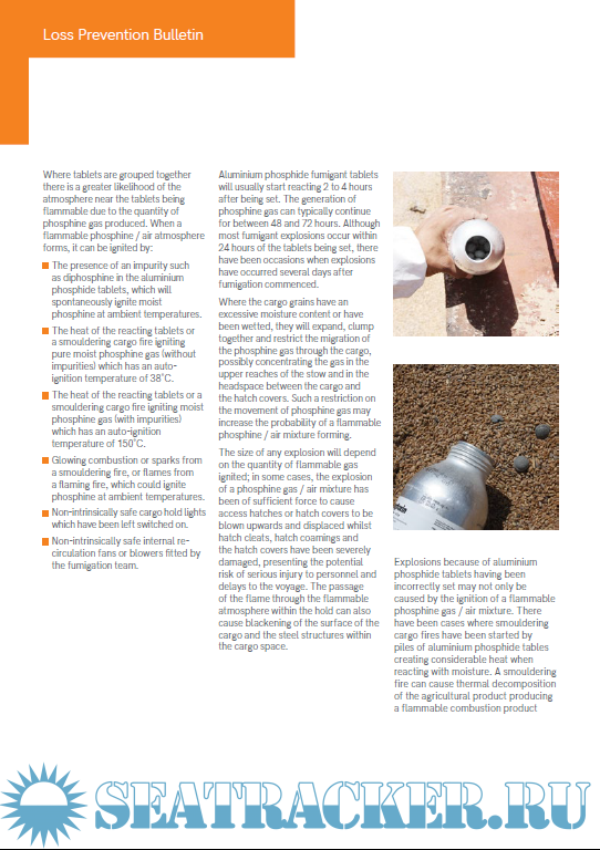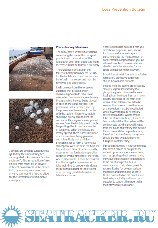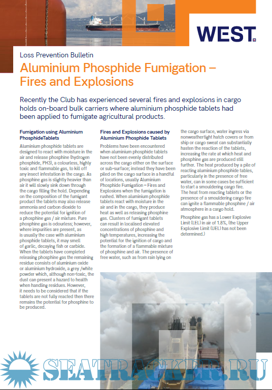 Year: 2020 Language: english Author: West P and I Club Genre: Periodical (magazine) Format: PDF Quality: eBook Pages count: 4 Description: As noted earlier, the presence of free water in contact with aluminium phosphide tablets will speed up the reaction causing higher temperatures and the production of more phosphine gas, heightening the possibility of a flammable atmosphere being formed in the hold. The cargo surface must therefore be kept dry, protected from precipitation during loading and, it should be considered that sweat may form on the cargo or on hold steelwork while the holds are sealed whilst fumigation is in progress.