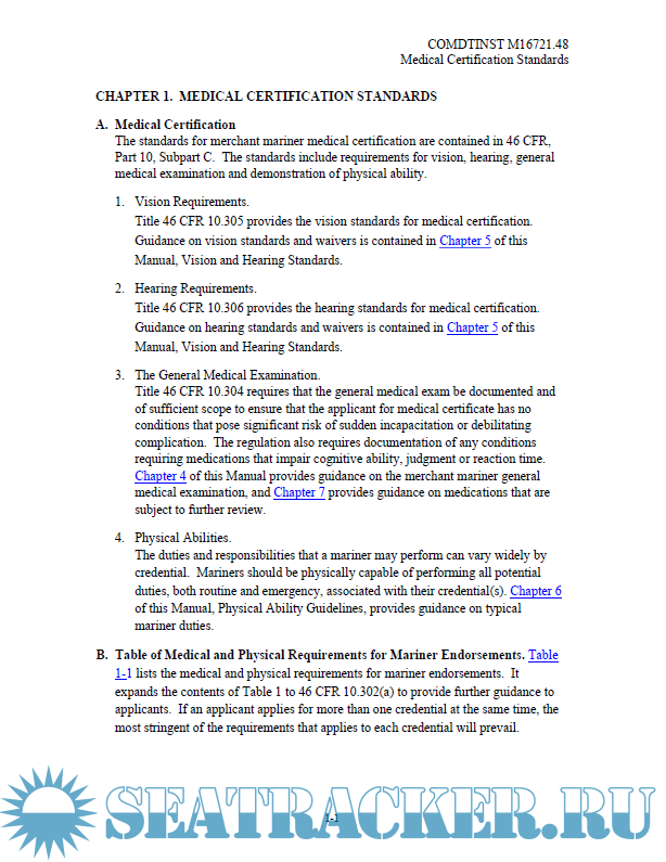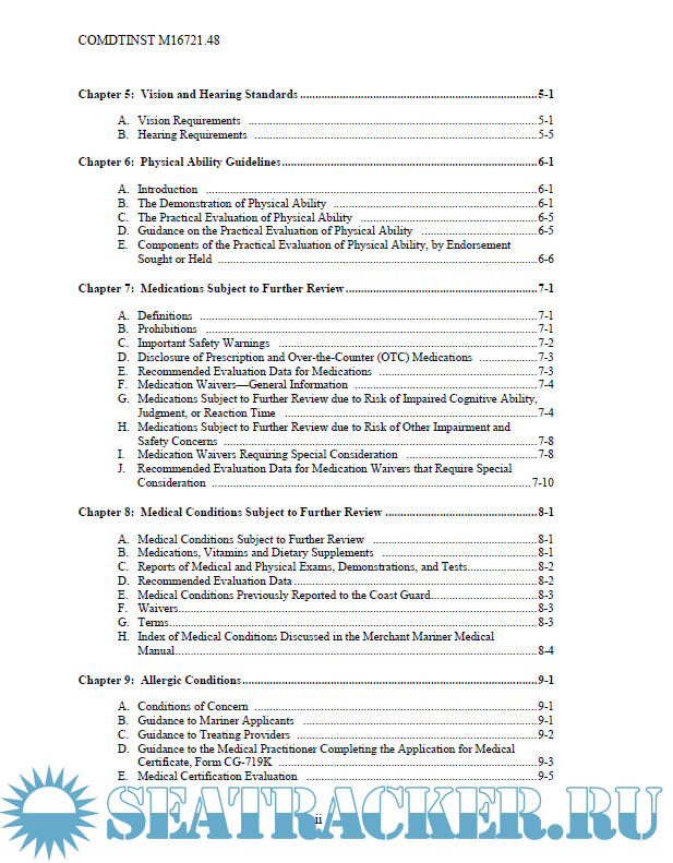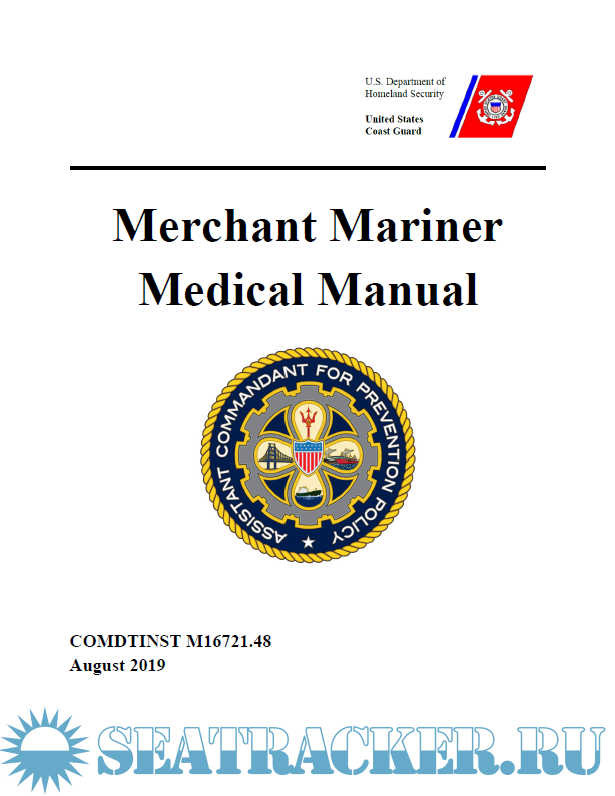 Year: 2019 Language: english Author: United States Coast Guard Genre: Manual Publisher: United States Coast Guard Format: PDF Quality: eBook Pages count: 297 Description: This Manual provides guidance for evaluating the physical and medical condition of applicants for merchant mariner medical certificates. The guidance in this Manual should assist medical practitioners, the maritime industry, individual mariners, and U.S. Coast Guard (hereinafter, Coast Guard) personnel in evaluating an applicant’s physical and medical status to meet the requirements of References (a) through (d). Ref: (a) Title 46 United States Code (U.S.C.), Subtitle II, Part E (b) International Convention on Standards of Training, Certification and Watchkeeping for Seafarers, 1978, as amended (STCW) (c) Title 46, Code of Federal Regulations (CFR), Part 10, Subpart C (d) Title 46 CFR Parts 401 and 402 (e) 80 Federal Register (FR) 8586, February 18, 2015
