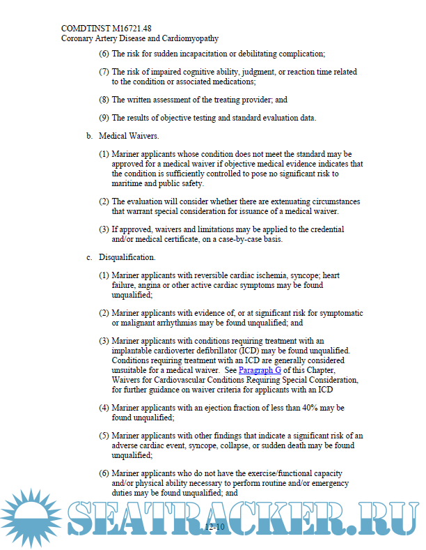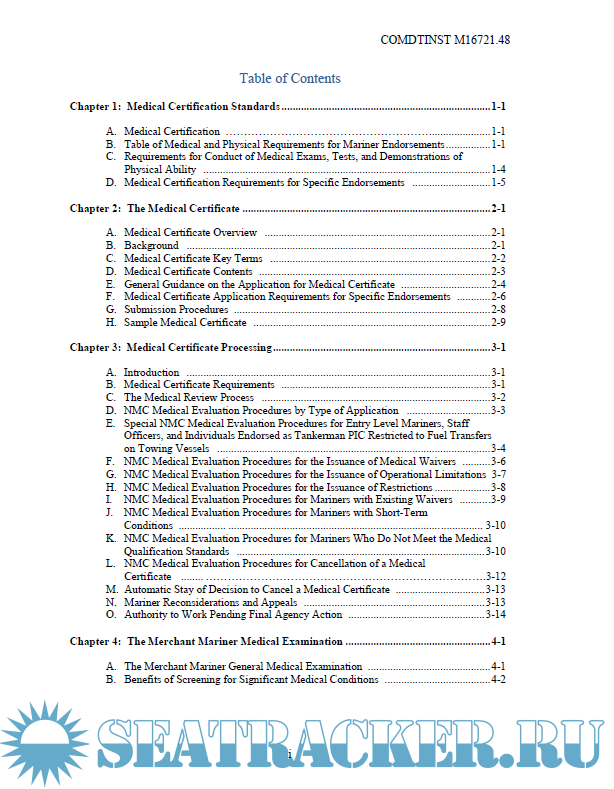 Description: This Manual provides guidance for evaluating the physical and medical condition of applicants for merchant mariner medical certificates. The guidance in this Manual should assist medical practitioners, the maritime industry, individual mariners, and U.S. Coast Guard (hereinafter, Coast Guard) personnel in evaluating an applicant’s physical and medical status to meet the requirements of References (a) through (d).