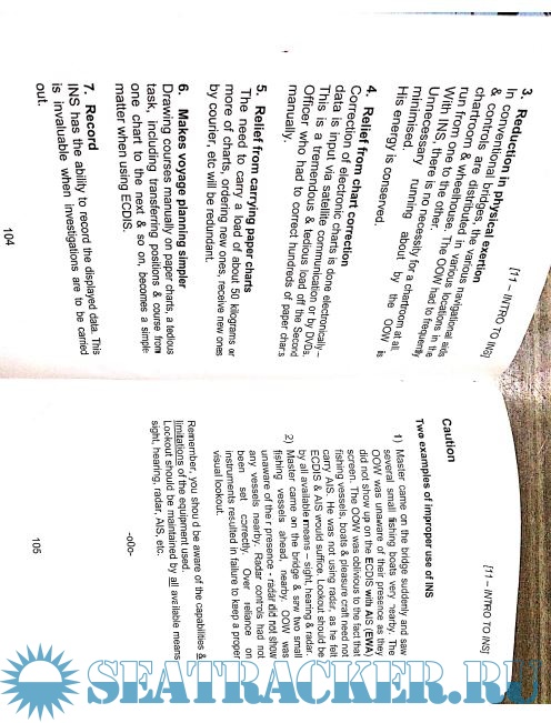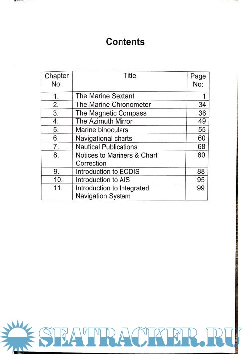 Year: 2012 Language: english Author: Capt. H. Subramaniam Genre: Textbook Publisher: Vijaya Publications Edition: 1st Format: PDF Quality: Photo of pages Pages count: 71 Description: From the author: This book was planned many years ago but delayed because priorities changed frequently when the writing/revision of books on other subjects was deemed more important. In the interim period, three booklets were published namely, “The Marine Sextant”, “The Marine Chronometer” and “The Magnetic Compass”. These booklets proved to be very popular. They would be discontinued when this book is published. Recently, I took up teaching at pre-sea academies as a visiting faculty member and found that this new book was of utmost importance to those students – hence the completion of this book that I commenced writing many years ago. I have made the chapter on the sextant more crisp with detailed diagrams on checking its errors. I have reduced the chapter on the chronometer considerably bearing in mind that most of the modern ships do not carry a chronometer as they use the GPS clock for correct time! I have added several chapters on other equipment, Charts, Chart Correction, & Publications. Teaching at pre-sea academies gives me more satisfaction than lecturing at post sea colleges as the young cadets look up to you as a role model, an icon or even a hero. They tend to think “One day I hope to be like him,” barring the current waistline!