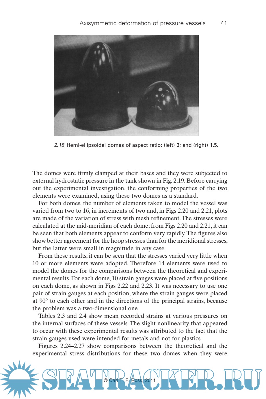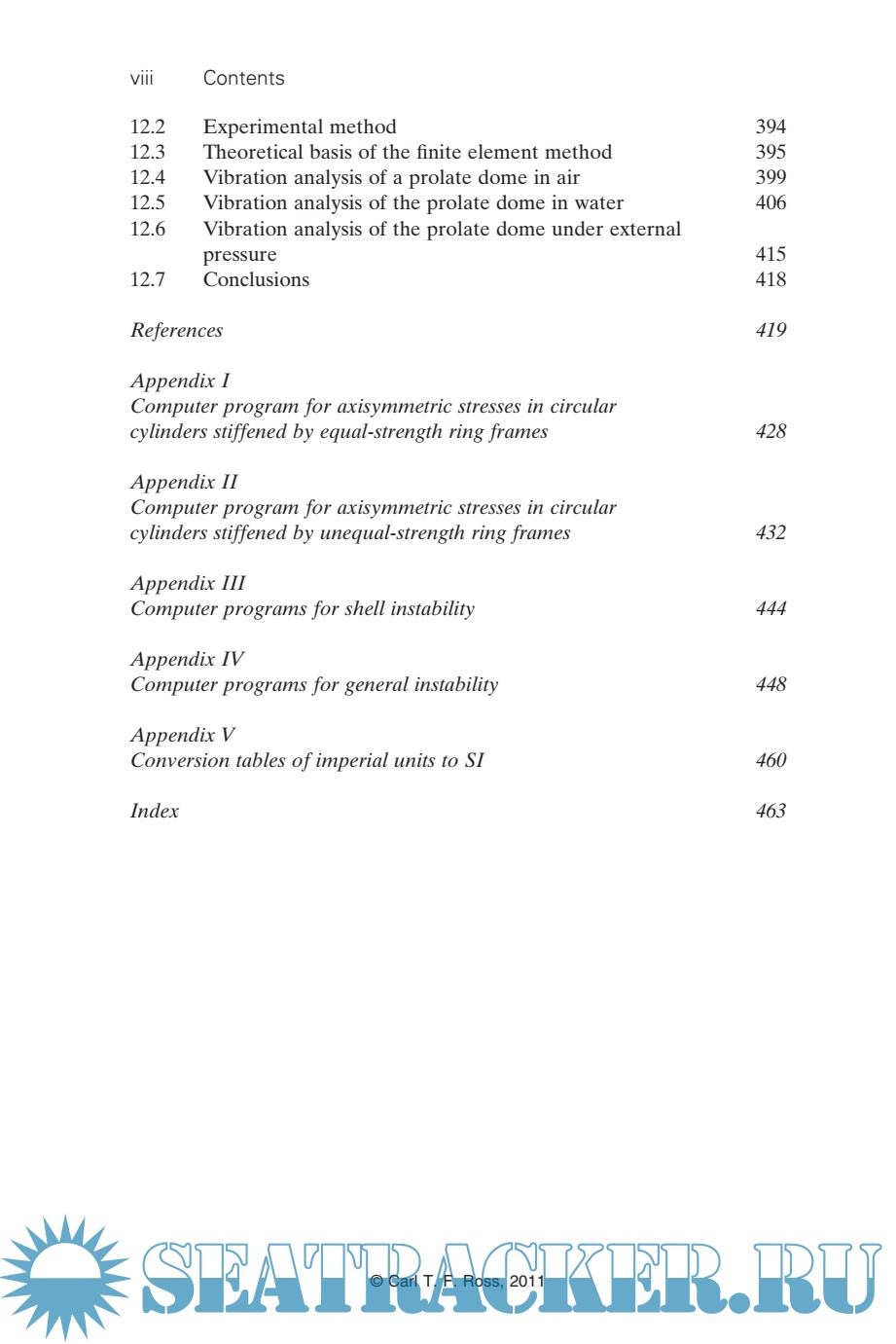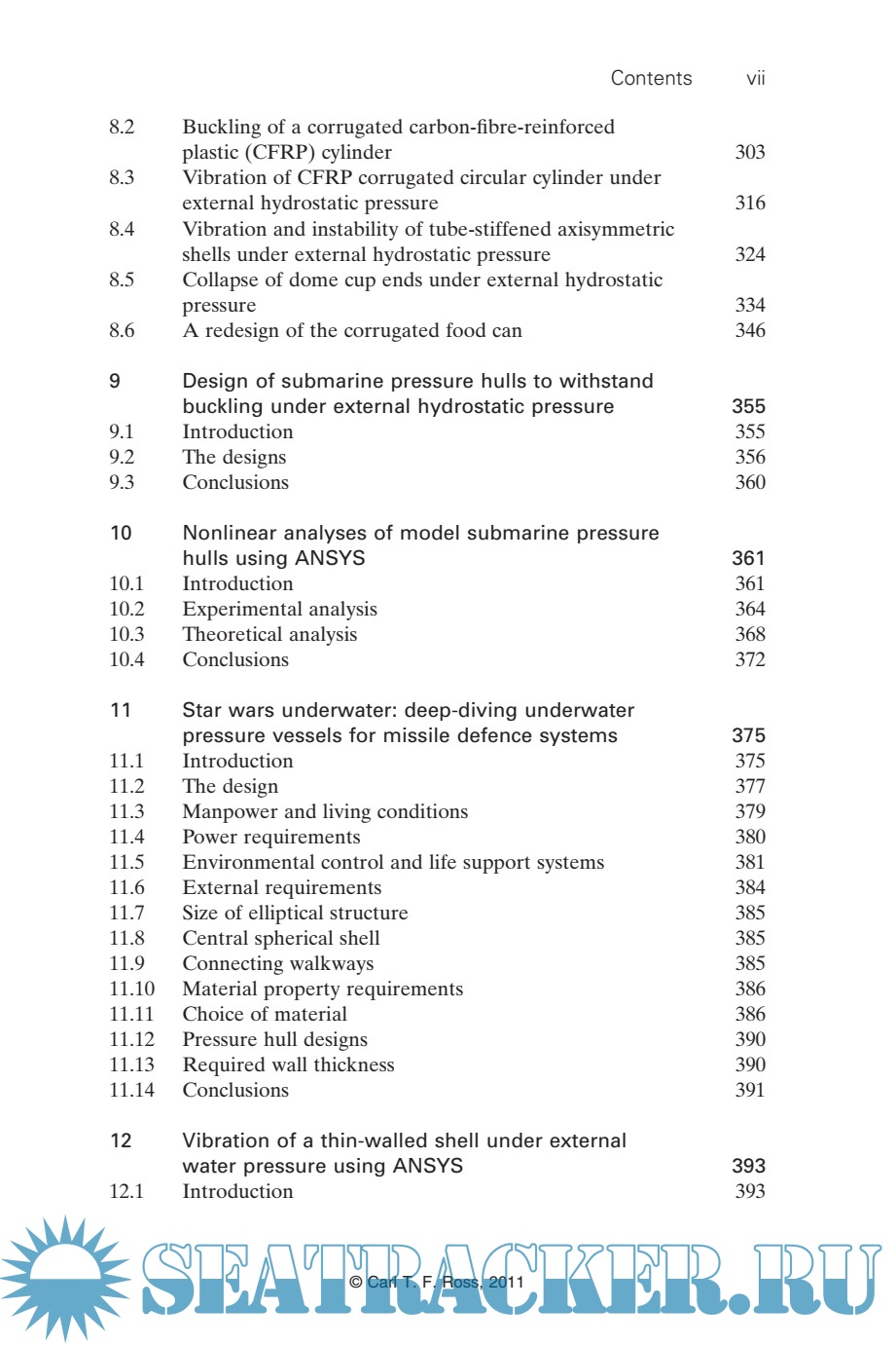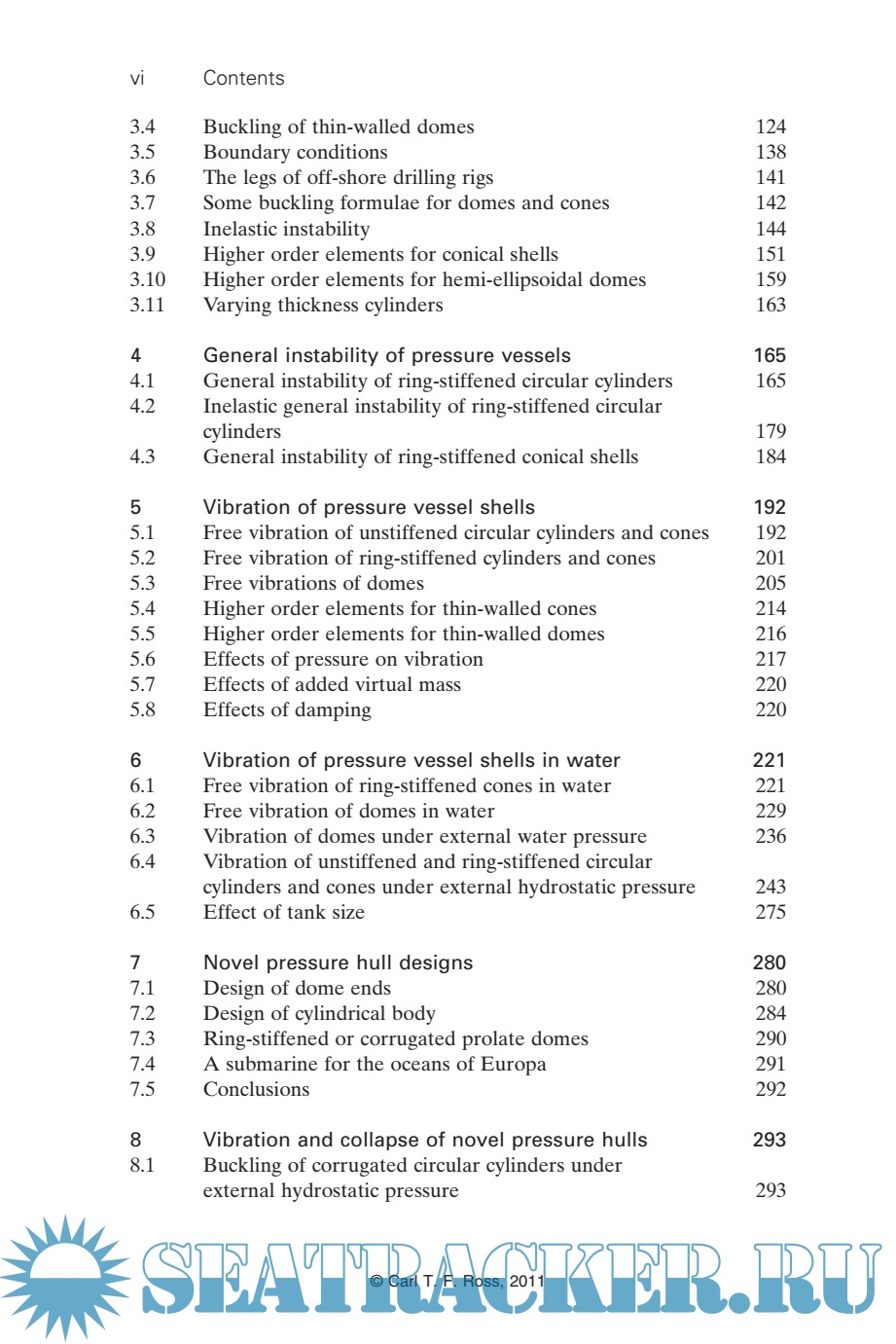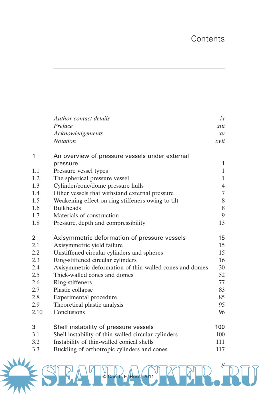 Year: 2011 Language: english Author: Ross C.T.F. Genre: Technical book Publisher: Woodhead Publishing Ltd Edition: 2nd ISBN: 9780857092489 Format: PDF Quality: Scanned pages Pages count: 501 Description: This book provides theoretical and experimental investigations on vessels under external pressure together with design hints. Highly beneficial to naval architects, ocean engineers, pressure vessel designers and aeronautical engineers and post graduates. Illustrated with 180 diagrams and 120 references. Key Features: presents an overview of the types of vessels under external pressure and materials used for construction; assesses axisymmetric deformation and different types of instability covering vibration of pressure vessel shells; explores novel pressure hulls, covering design, vibration and collapse concentrating on the design and non-linear analysis of submarine pressure hulls.