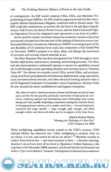 Year: 2006 Language: english Author: Lawrence W. Prabhakar, Joshua H. Ho & Sam Bateman Publisher: Institute of Defence and Strategic Studies ISBN: 981-256-828-X Format: PDF Quality: OCR with errors Pages count: 319 Description: The Asia-Pacific has emerged as the hub of global geo-political, geo-economic and geo-strategic significance in the post-Cold War period. It has even displaced the Euro-Atlantic region, which had been dominant during the Cold War. The emergence of the Asia-Pacific is reflected in the region's high economic growth and large volume of maritime trade. For example, intra-Asia-Pacific Economic Cooperation (APEC) trade exceeds intra-European Union (EU) trade. In terms of volume of trade as well as the location of the future engines of economic growth, the APEC region could be regarded as the powerhouse of the present global economic order. The volume is also an outcome of the Institute's Maritime Security Programme, one aspect of which is to study the changing maritime balance of power in the Asia-Pacific region. IDSS would like to thank Dr. Lawrence Prabhakar, who was a visiting research fellow with the programme, for conceptualising the theme of the volume. The excellent contribution of the authorsof the chapter and that of the three co-editors is gratefully acknowledged. The programme remains committed to providing an avenue for cutting-edge research and publication on major issues and trends in maritime security in the Asia-Pacific.