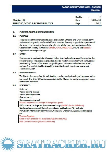 Description: The purpose of this manual is to guide the Master, Officers, and Crew to load, carry and unload cargoes in a safe and efficient manner. At every stage of the operation of the vessel due consideration must be given to all the rules and regulations of the Classification society, IMO codes (IMSBC, Grain, IMDG, CSS), SOLAS and National