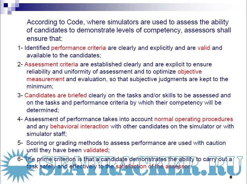 Description: According to Code, where simulators are used to assess the ability of candidates to demonstrate levels of competency, assessors shall ensure that: