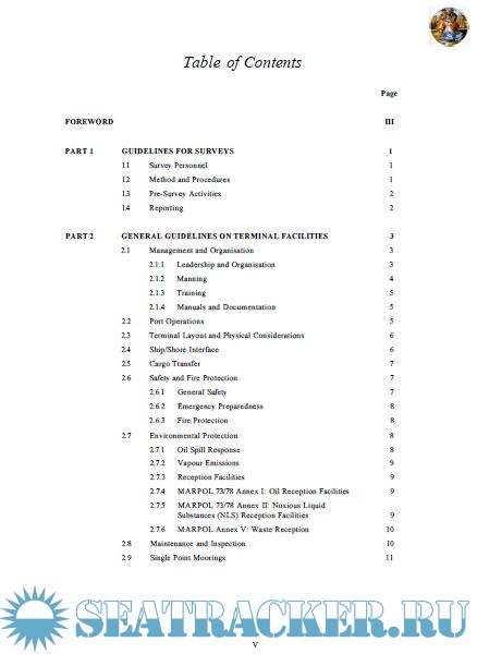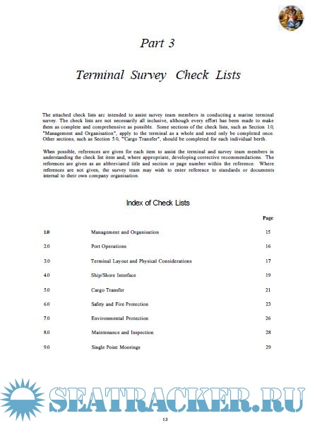 Description: This second edition of the Marine Terminal Survey Guidelines* has been published by the Oil Companies International Marine Forum (OCIMF), which acknowledges the assistance of the Society of International Gas Tanker and Terminal Operators (SIGTTO), to encourage the assessment of standards of safety and environmental protection at chemical, gas, and oil terminals on a world-wide basis.