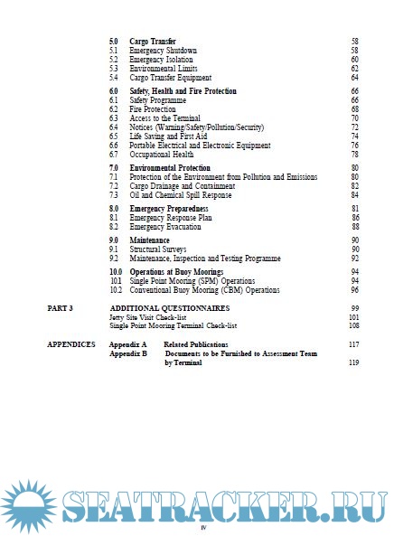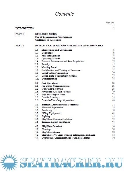 Description: The Marine Terminal Baseline Criteria and Assessment Questionnaire has been published by the Oil Companies International Marine Forum (OCIMF) to encourage the uniform assessment of standards of safety and environmental protection at chemical, gas, and oil terminals. This publication supercedes the Marine Terminal Survey Guidelines published in 1995 by OCIMF with the assistance of the Society of International Gas Tanker and Terminal Operators (SIGTTO). The Baseline Criteria are written for the assessment of fixed piers, sea islands and buoy mooring terminals. They are not intended for use at producing facilities such as offshore platforms and deepwater loading systems, although the contents could be adapted for such purpose.