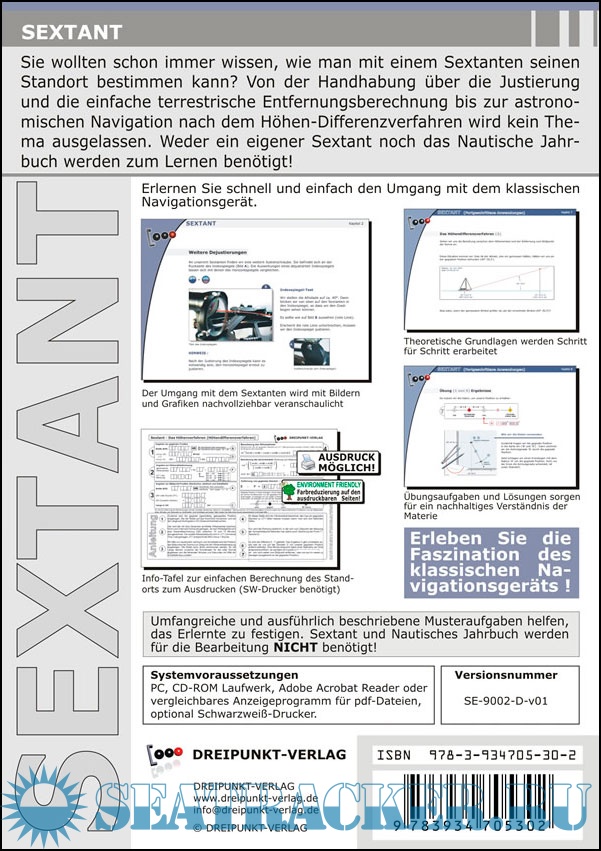 Year: 2006 Version: 020.01.2006.v03 Developer: DREIPUNKT-VERLAG by Michael Schulze Platform: PC (Windows) Windows7 compatibility: full System Requirements: Browser, latest Flash player Localization: english Crack: Not needed Description: Der Sextant ist das klassische Navigationsgerät, das auch in den Zeiten von GPS nicht an Aktualität eingebüßt hat. Mit Hilfe dieses Programms werden Sie in kleinen und nachvollziehbaren Schritten an die Sextantbenutzung herangeführt. Aus dem Inhalt:
