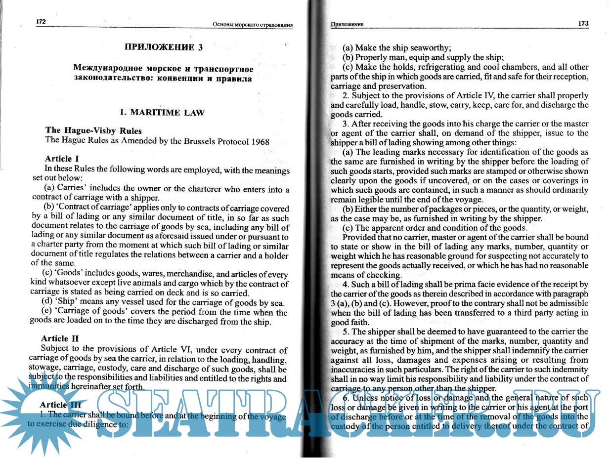 Доп. информация: Для российского читателя этот учебник может быть интересен, прежде всего, потому, что в нем в ясной и доходчивой форме даны основные понятия и механизм морского страхования. Существенной особенностью научного редактирования явилось то, что, так как морское страхование носит международный характер и все документы, его сопровождающие, написаны на рабочем английском языке, многие тексты приводятся в оригинале с русским подстрочником. Именно поэтому текст снабжен подстрочными английскими международными терминами по страхованию вообще и морскому страхованию, в частности.