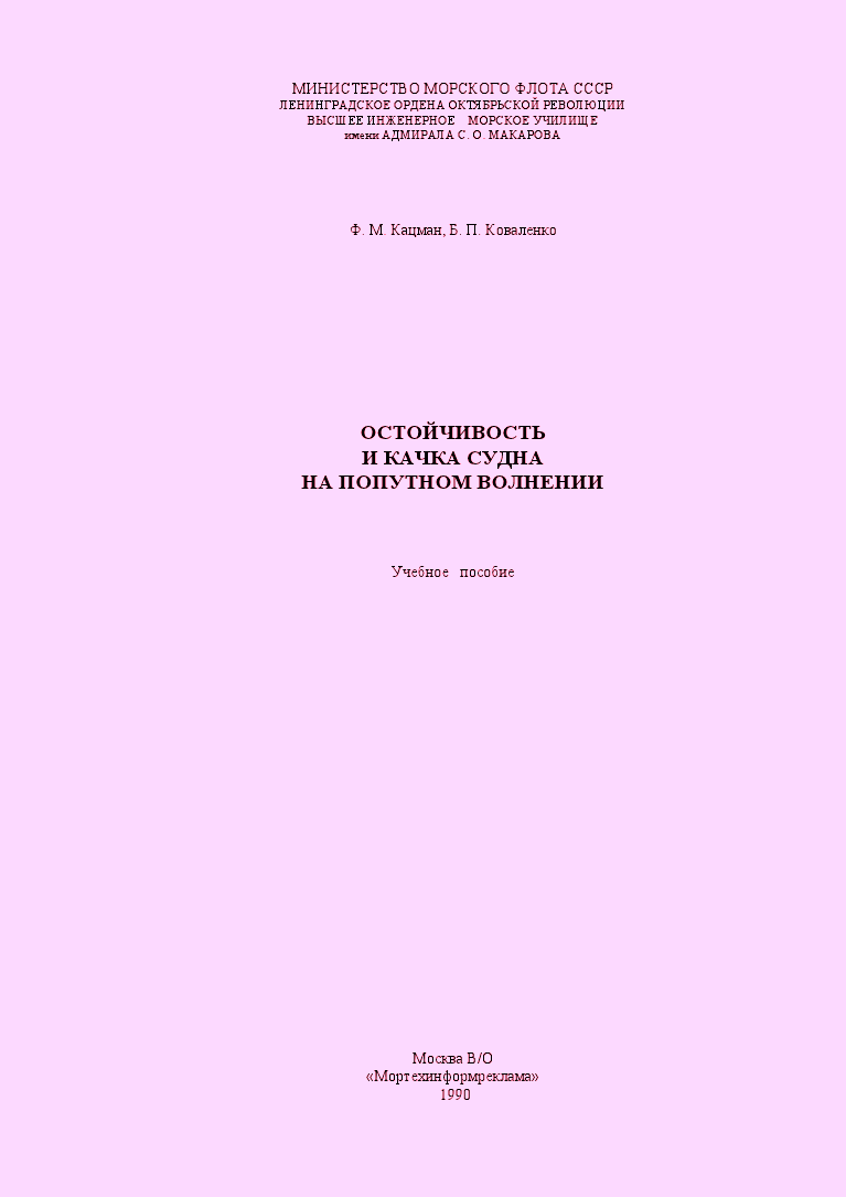 Описание: В учебном пособии изложены физические основы поведе¬ния судна на попутном волнении, рассмотрены вопросы нор¬мирования остойчивости судов в этом режиме движения, во¬просы бортовой качки судна на попутном волнении и кормо¬вых курсовых углах, а также раскрыты явления захвата суд¬на волной и брочинга, даны практические рекомендации для судоводителей.