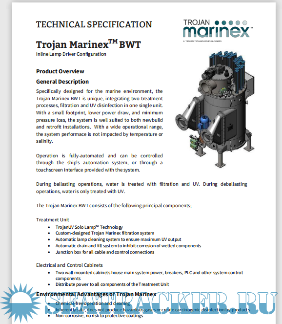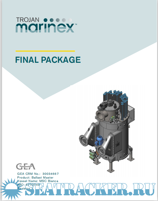 Year: 2017 Language: english Author: Trojan marinex Genre: Instruction Format: PDF Quality: eBook Number of pages: 399 Description: General Description Specifically designed for the marine environment, the Trojan Marinex BWT is unique, integrating two treatment processes, filtration and UV disinfection in one single unit. With a small footprint, lower power draw, and minimum pressure loss, the system is well suited to both newbuild and retrofit installations. With a wide operational range, the system performance is not impacted by temperature or salinity. Operation is fully-automated and can be controlled through the ship’s automation system, or through a touchscreen interface provided with the system. During ballasting operations, water is treated with filtration and UV. During deballasting operations, water is only treated with UV.The Trojan Marinex BWT consists of the following principal components; Treatment Unit • TrojanUV Solo Lamp™ Technology • Custom-designed Trojan Marinex filtration system • Automatic lamp cleaning system to ensure maximum UV output • Automatic drain and fill system to inhibit corrosion of wetted components • Junction box for all cable and control connections
