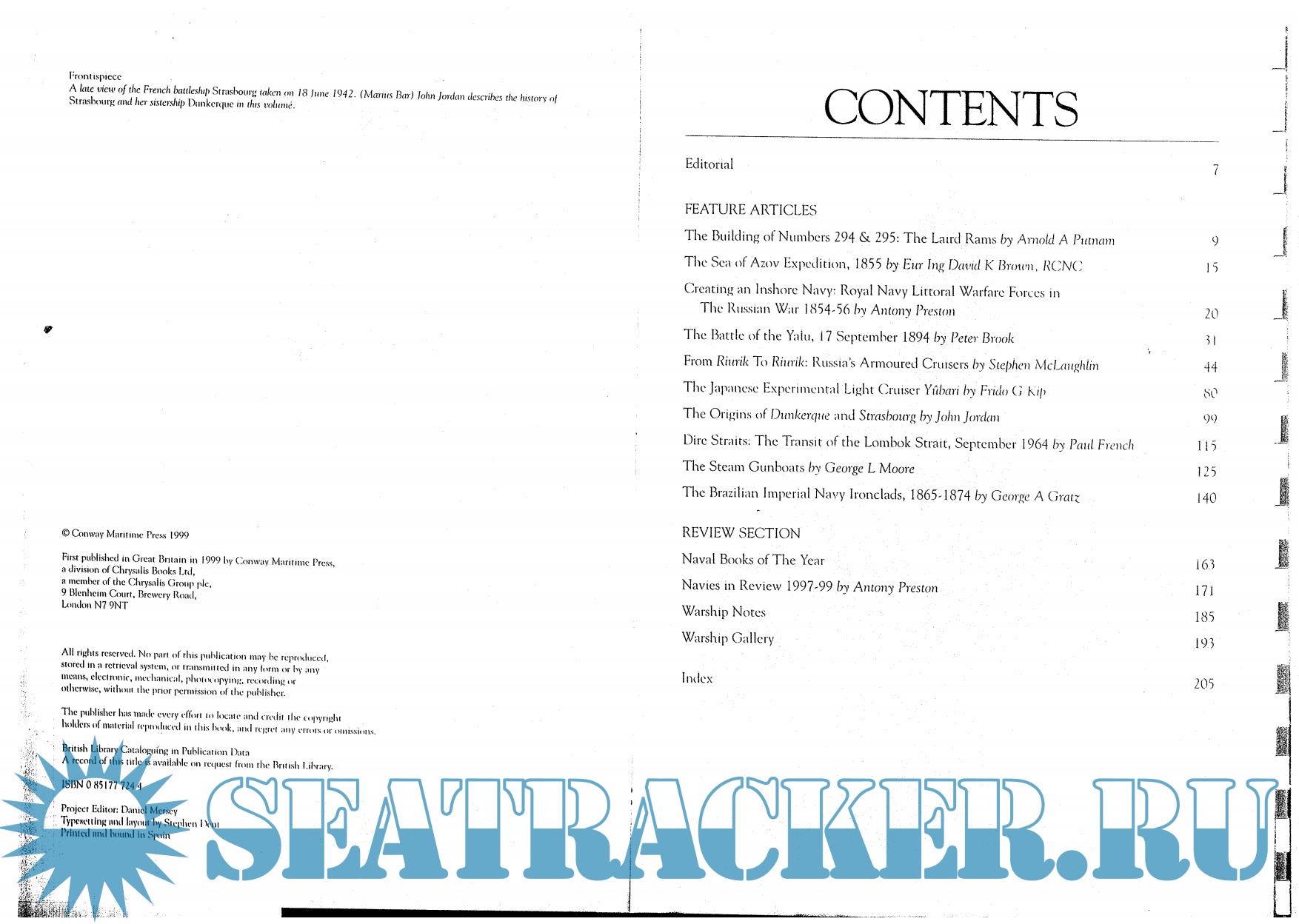 Year: 1999 Language: english Author: Preston A.(ed.) Genre: Periodical (magazine) Publisher: Conway Maritime Press Edition: 1st ISBN: 0851777244 Format: PDF Quality: Photo of pages Pages count: 199 Description: The 1999-2000 Edition of Conway's Warship Annual Volume XXII of this series devoted to design, development and service history of the world's combat ships. Items cover a wide range of interest and time periods including two articles on the Crimean war, history of the Laird rams (CSA purchase), the battle of the Yalu (Japanese-Chinese war 1894-1895), Brazilian ironclads and French fast battleships Dunkerque and Strasbourg class. A modern incident involving the UK and indonesia concerning transit of the Lombok strait in 1964 rounds out the exceptional book. Well written and full of photos that extensively cover the subject.
