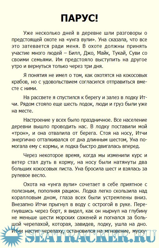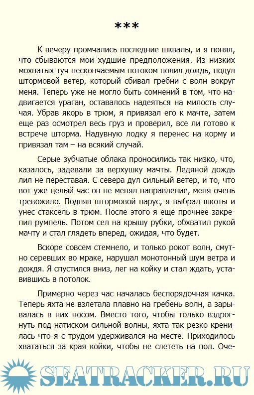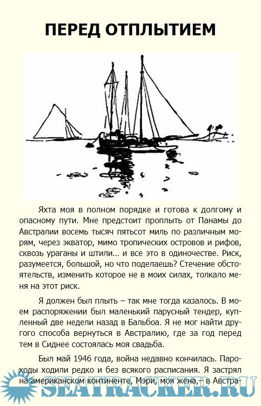 Маленькая яхта покинула берега Панамы и вышла в открытое море. На борту крохотного суденышка был всего один человек. Он намеревался переплыть Тихий океан и добраться до Австралии. Тысячи километров прошла яхта по бескрайним океанским просторам, много опасностей и приключений пережил смелый мореплаватель, не раз лицом к лицу встречаясь со смертью. Штиль и хорошая погода сменялись порывистыми ветрами и штормами; моря, богатые рыбой, чередовались с "мертвыми" водами, где не было почти никаких признаков жизни. Мореплаватель пережил и отчаяние и радость победы в борьбе со стихией. Закончив свое путешествие, он описал его в настоящей увлекательной книге.
