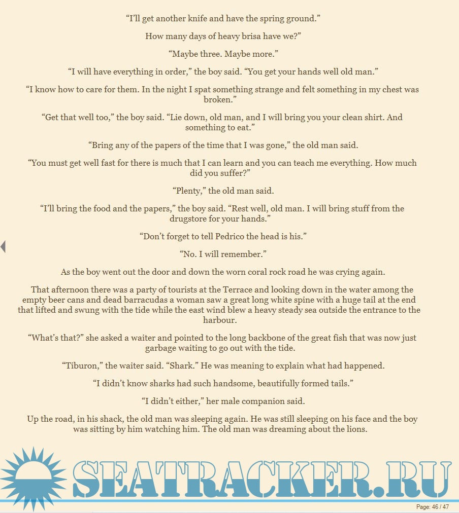 Year: 1994 Language: english Author: Ernest Hemingway Genre: Fiction Format: EPUB Quality: eBook Pages count: 47 Description: Set in the Gulf Stream off the coast of Havana, Hemingway's magnificent fable is the story of an old man, a young boy and a giant fish. Here, in a perfectly crafted story, is a unique and timeless vision of the beauty and grief of man's challenge to the elements in which he lives. Not a single word is superfluous in this widely admired masterpiece, which once and for all established his place as one of the giants of modern literature. Additional info: One of the greatest novels of the 20th century by one of the greatest writers in American history - The book that won Ernest Hemingway the Nobel Prize for Literature.